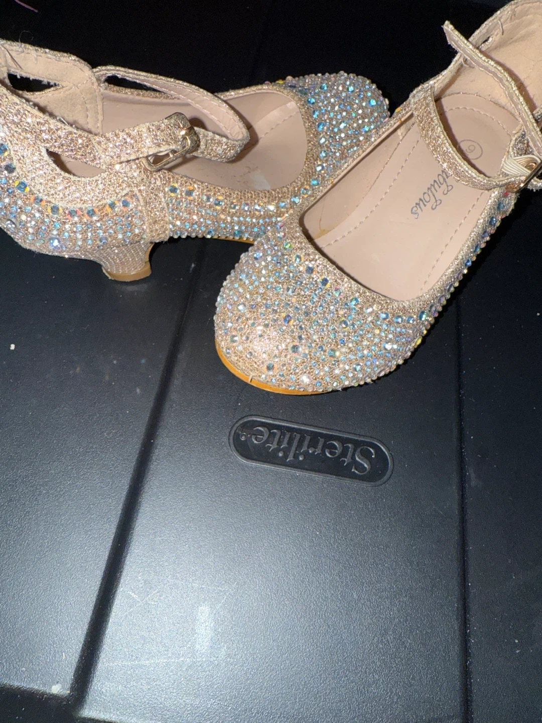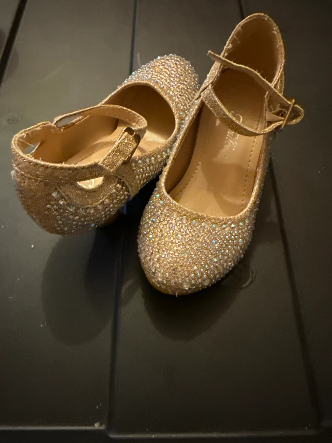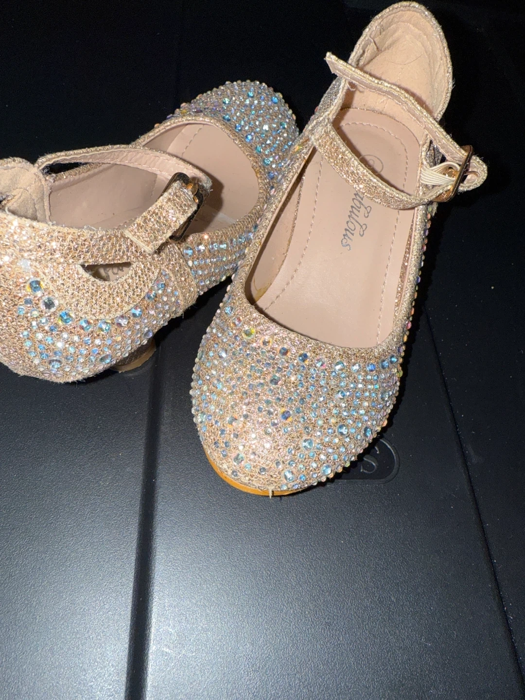 These adorable girls' dress shoes are perfect for any special occasion! They're a beautiful gold colour and covered in sparkly glitter and little gems. The shoes have a cute ankle strap with a buckle. Size 12