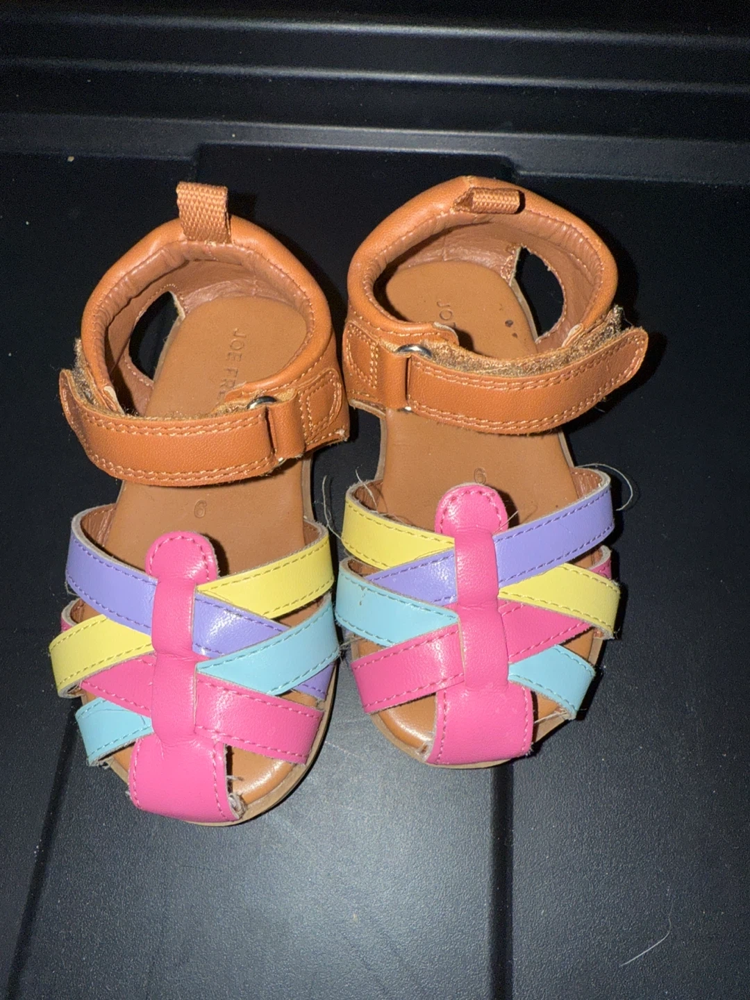 Cute pair of Joe Fresh sandals in a size 6. They feature a colourful design with pink, yellow, and blue straps. Perfect for summer!