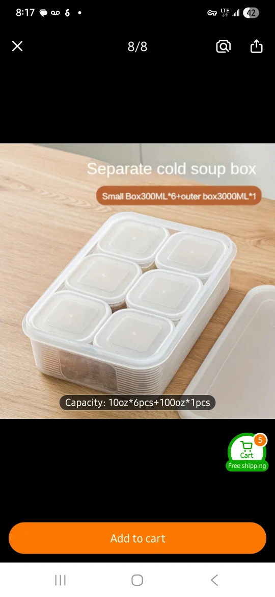 Keep your food fresh and organized with this handy food storage container set! The set includes 6 smaller 10oz containers that fit perfectly into the larger 100oz container. Perfect for storing leftovers, meal prepping, or packing lunches. They're clear so you can easily see what's inside, and the lids fit snugly to keep food fresh. Great for keeping your fridge tidy!