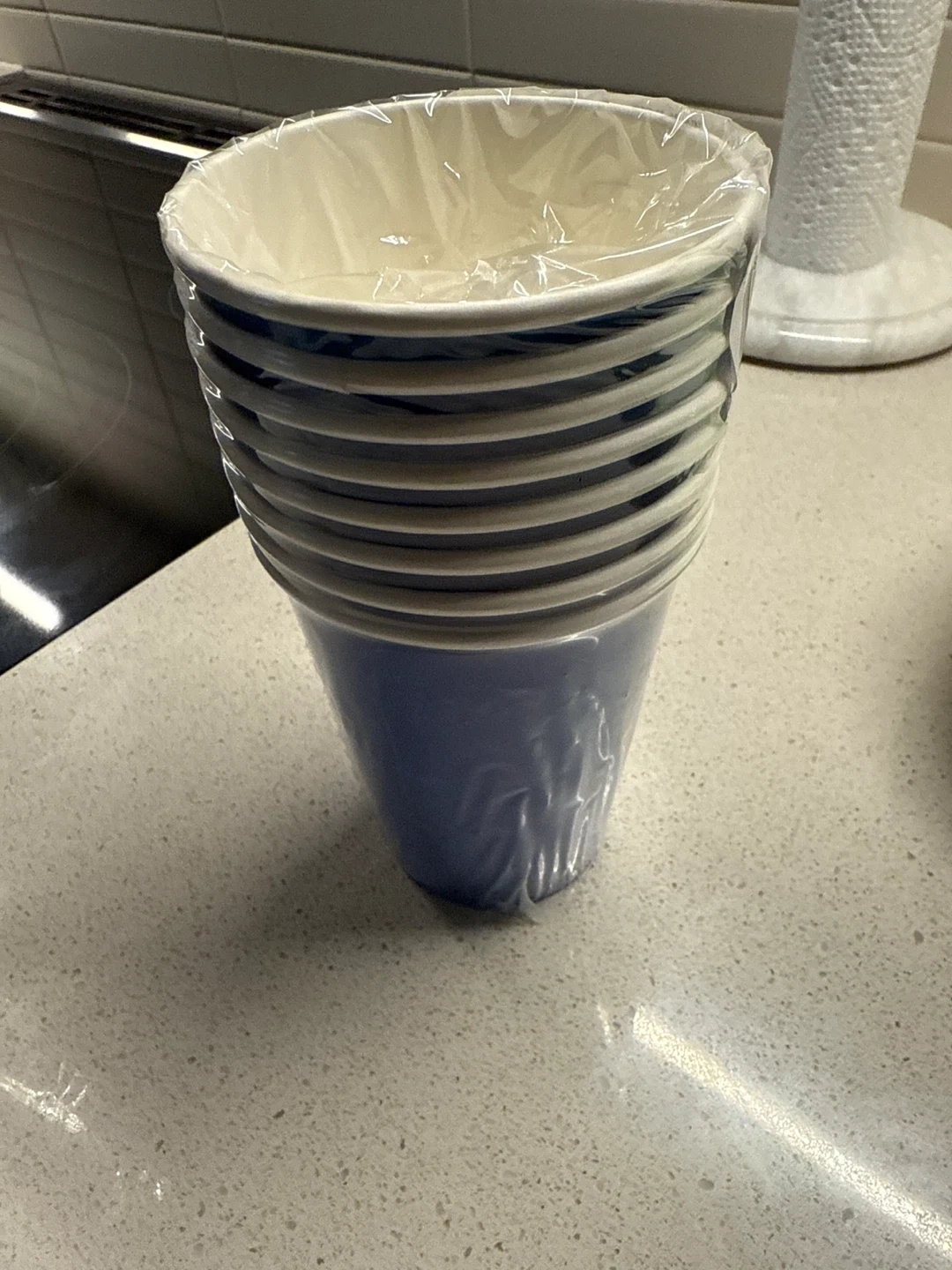 Selling a stack of 8 new blue paper cups! They're still sealed in plastic and ready for your next party or gatheringCASH ONLY
