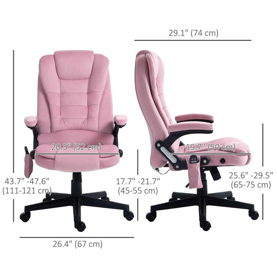 This office chair features a reclining function for added comfort. It has a high back design that supports your posture during long hours of work. The chair is equipped with swivel wheels for easy mobility. Its pink color adds a stylish touch to any office space. The massage feature helps relieve tension and stress. Ideal for both home and professional use. Easy to assemble and maintain. Overall Dimensions: 26.4" W x 29.1" D x 45.7" H. It has 6-Point Vibration and Velvet Reclining.
