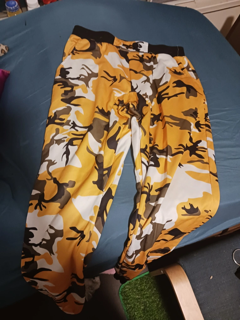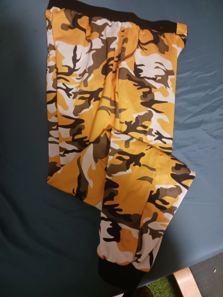 These are some comfy yellow camo joggers. They have a black waistband and cuffs. Great for anyone kid or adult running around!