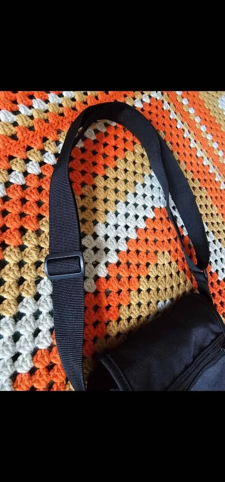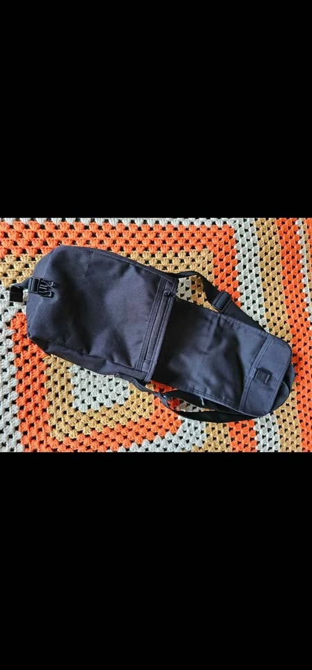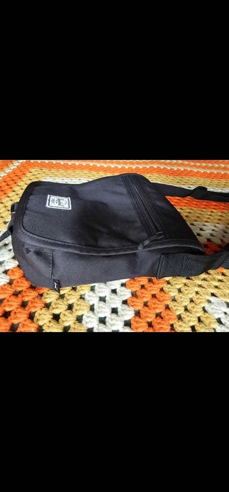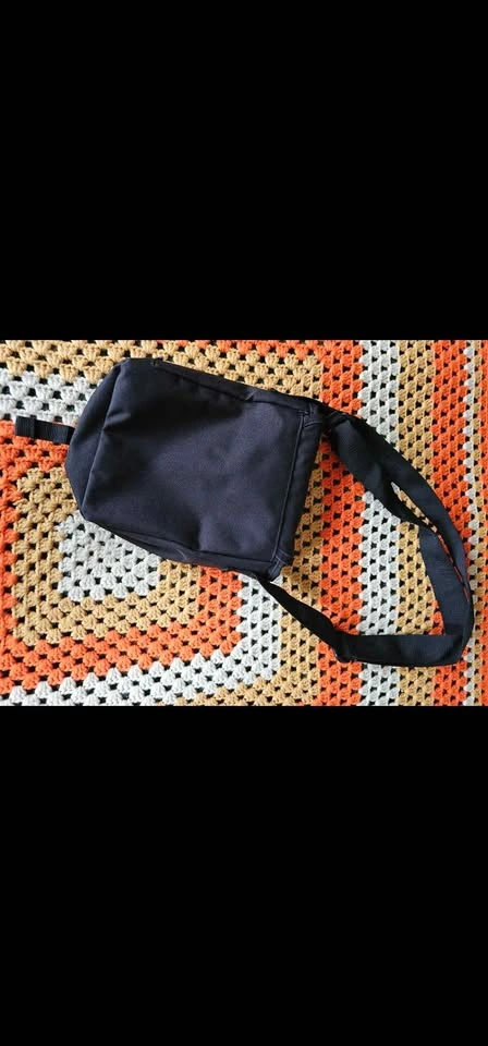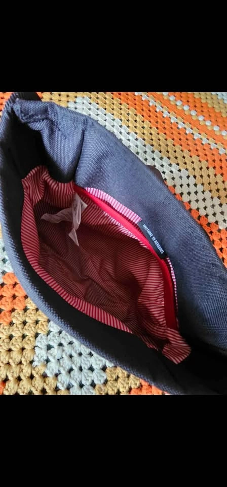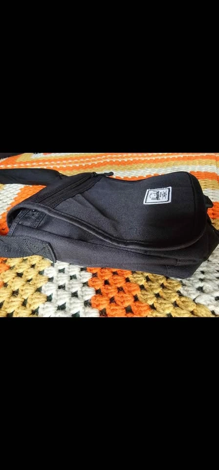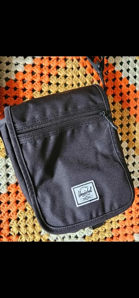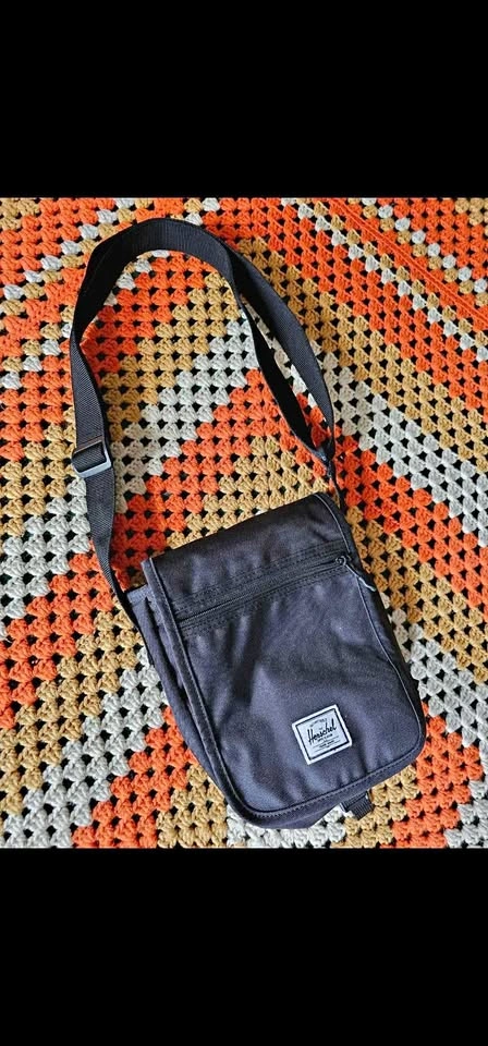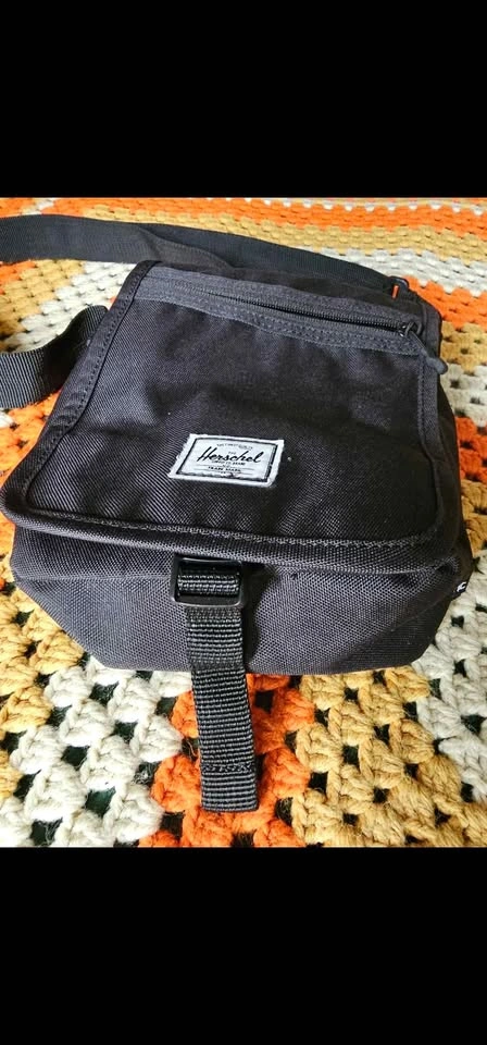 Versatile Lane Messenger Small crossbody bag from Herschel Supply Company, in monochromatic black. Perfect for everyday use and casual looks. "Designed to fit an iPad mini, the minimal Lane Small messenger is a vertical commuter style that offers multiple storage options and easy access to daily essentials. Signature striped fabric liner Internal storage sleeve Zippered main compartment and front storage sleeve Prusik cord zipper pulls Clip-fastened front cover Adjustable webbing crossbody strap Classic woven label Dimensions: 9"(H) x 6.75"(W) x 2.5"(D), 3.5L" Bag is in very good used condition with light signs of use. There is a slightly worn area on the right side of the bag, where the strap rubbed against the bag while in use (see last photo). Lining is clean.