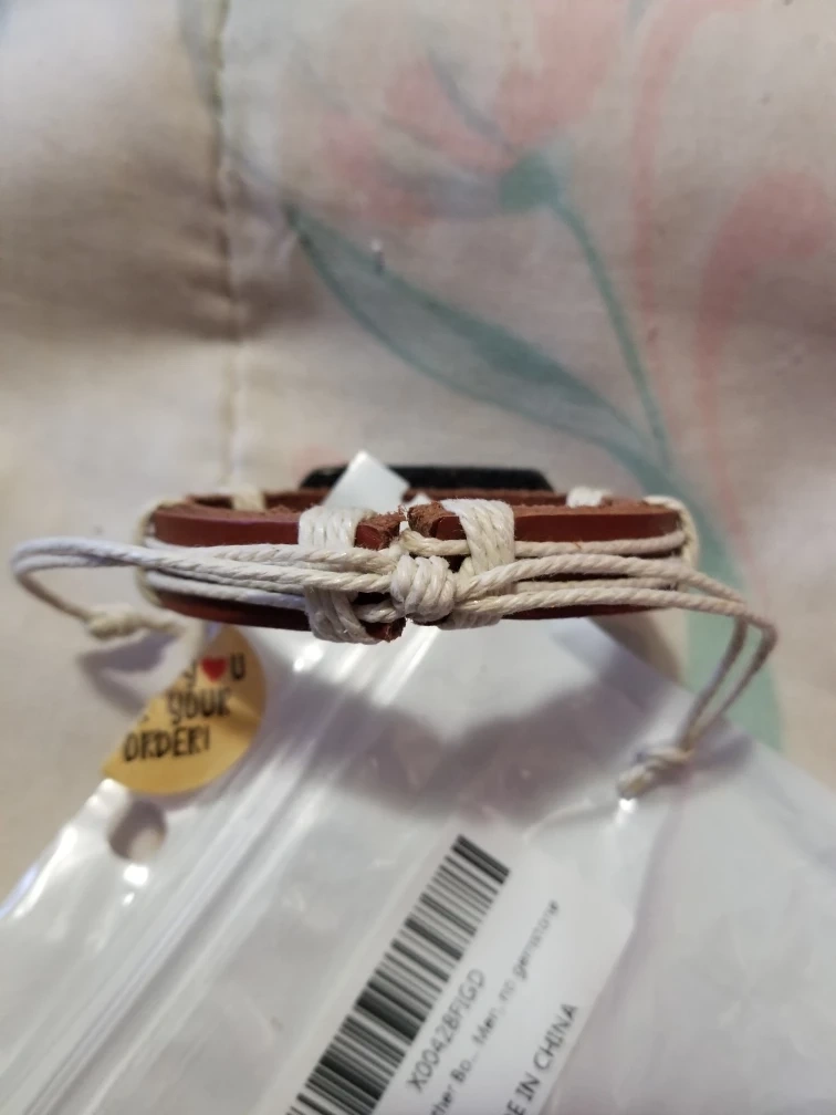 A bracelet made of a combination of materials. Includes string to adjust the size, a leather section, and a small butterfly-themed decorative piece. You can wear it while enjoying a relaxing day. Brand new