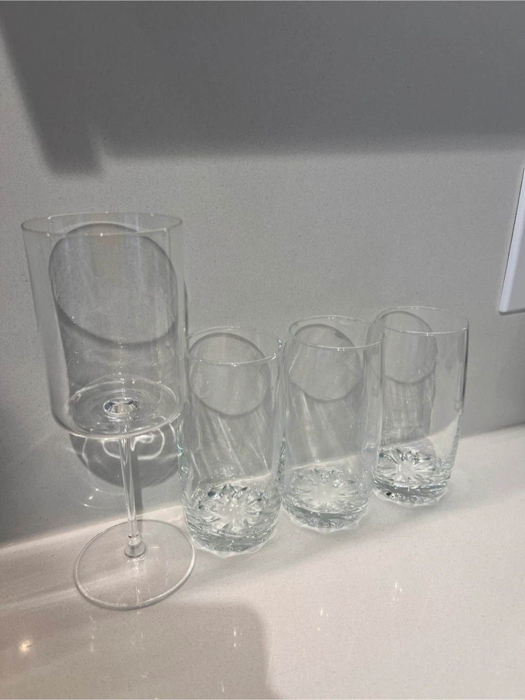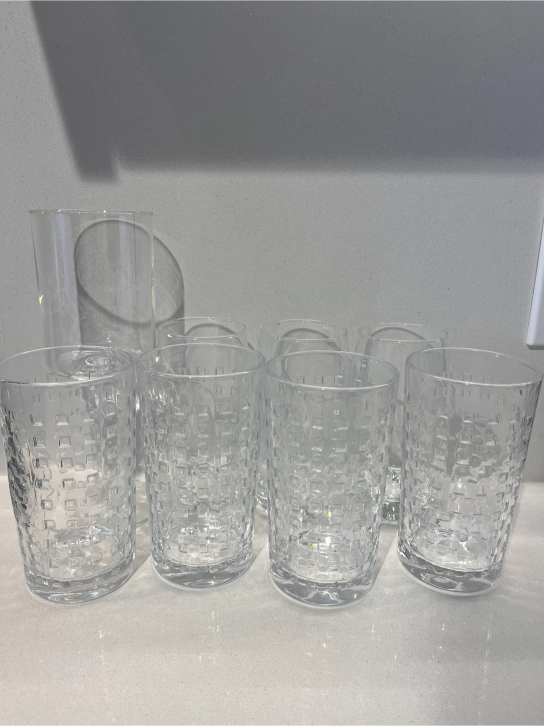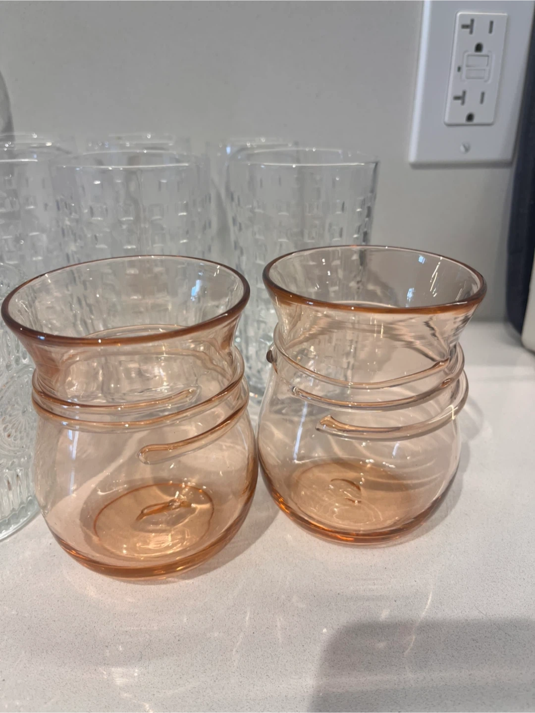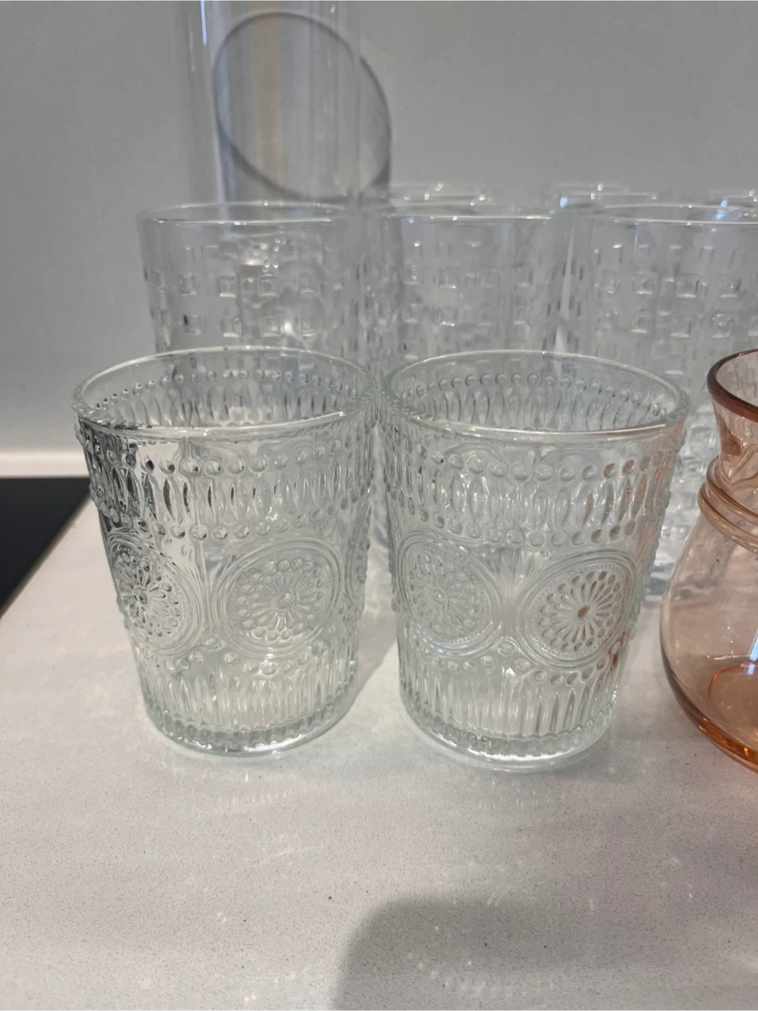 Selling a set of assorted glassware. There are various styles and sizes, perfect for different uses. Includes clear textured glasses and a couple of unique pink-tinted jars. Great for adding some variety to your kitchen collection