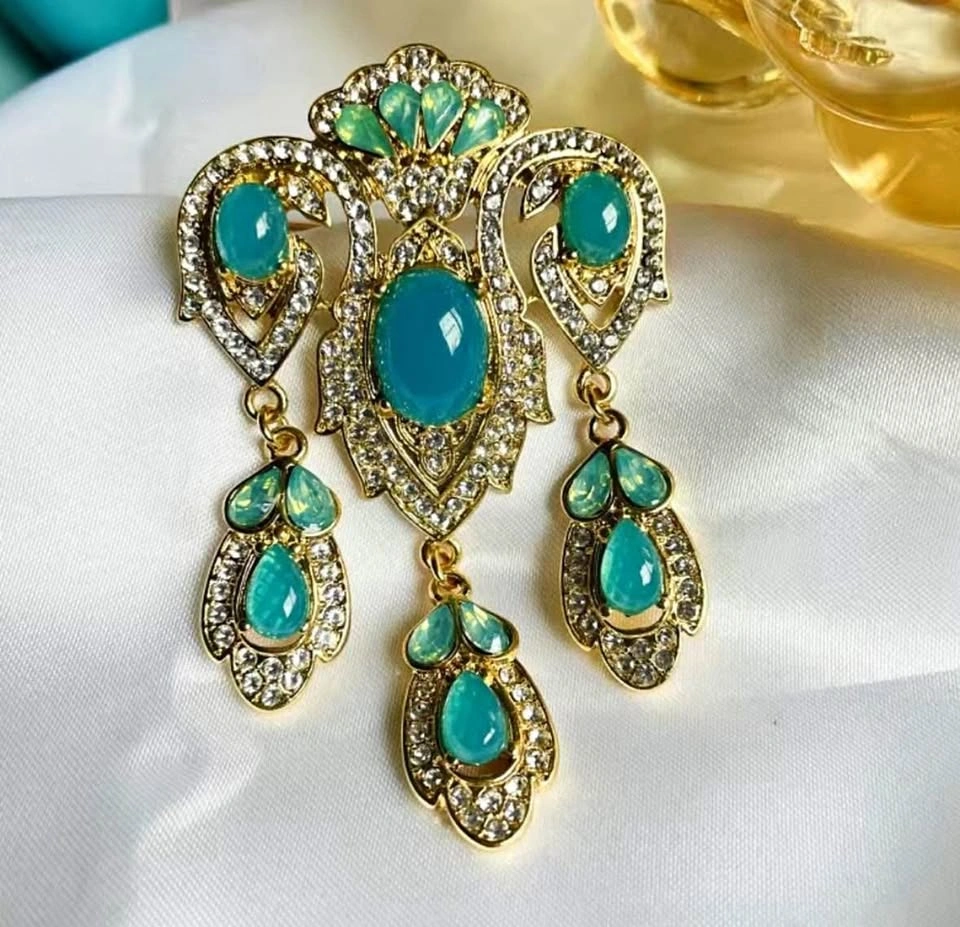 This gorgeous handcrafted brooch with rhinestones and cabochon style stones is reminiscent of an era gone by—grab it for your collection!