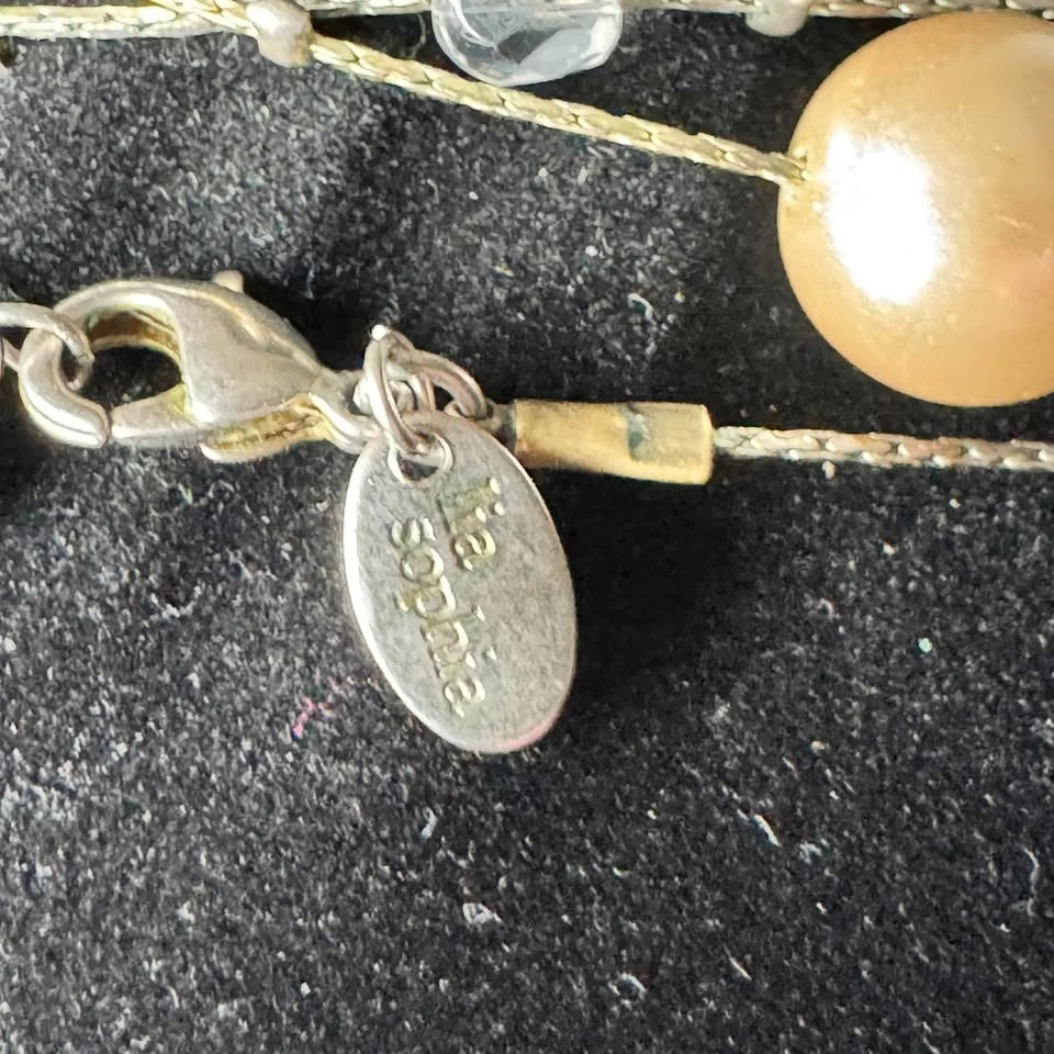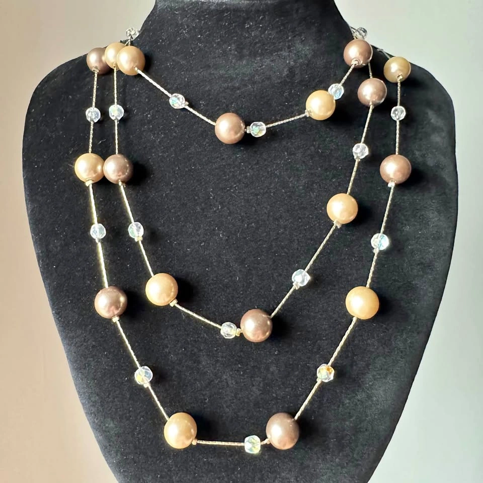 This exquisite Lia Sophia necklace showcases a sophisticated blend of gold, beige and brown hues. Long station necklace with clasp that can be worn long or doubled or tripled around the neck. Looks beautiful when worn layered. Lovely neutral tones that will elevate any outfit without overwhelming your ensemble—simple yet classy! The necklace is adorned with spherical glass pearls and contrasting smaller faceted iridescent spacer beads, creating a harmonious and elegant design. Length (end-to-end): 54”-57.5” Lovely vintage condition. Please see photos and let me know if you have any questions!