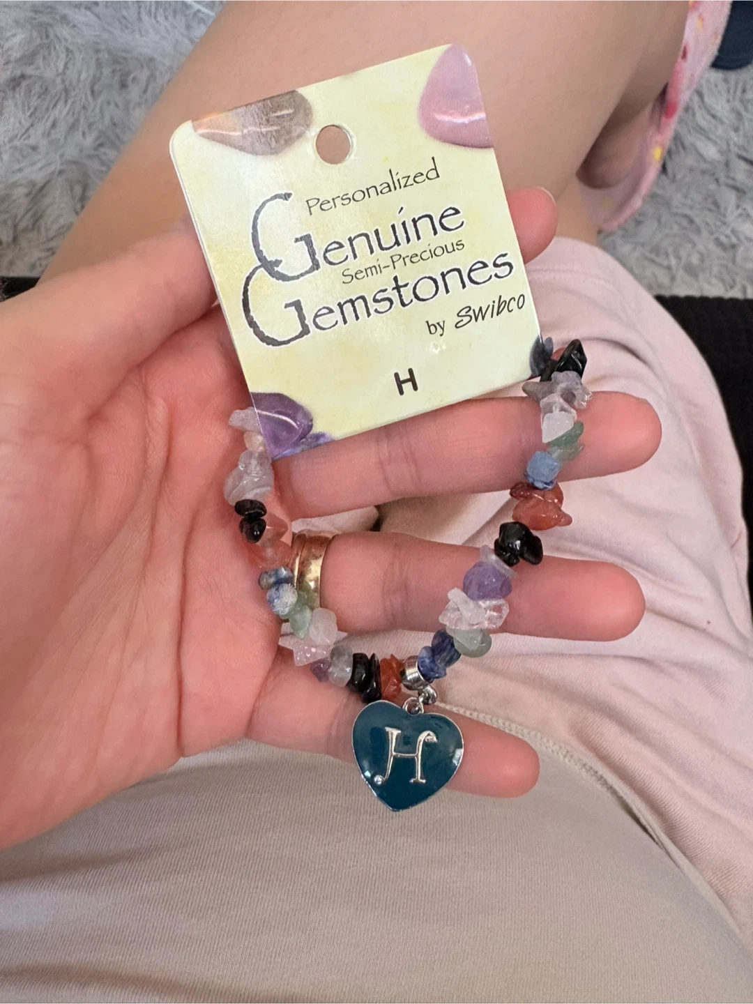 This is a cute Swibco bracelet featuring personalized, semi-precious genuine gemstones. It has a lovely charm with the letter H on it. Perfect for adding a touch of sparkle to any outfit!
