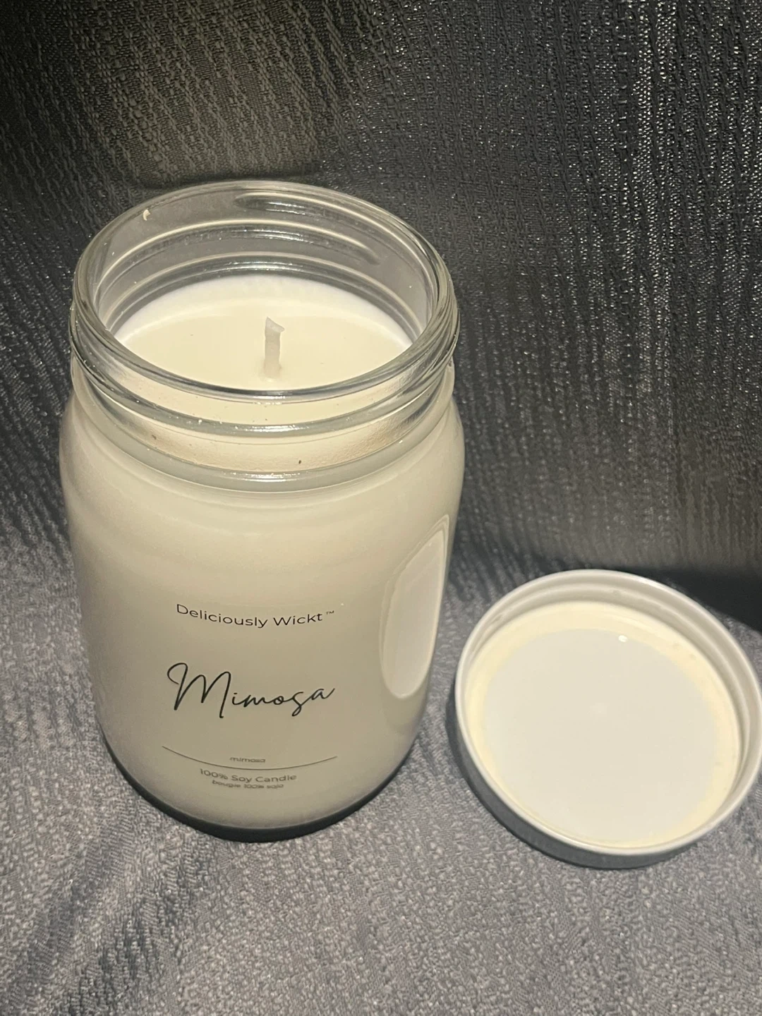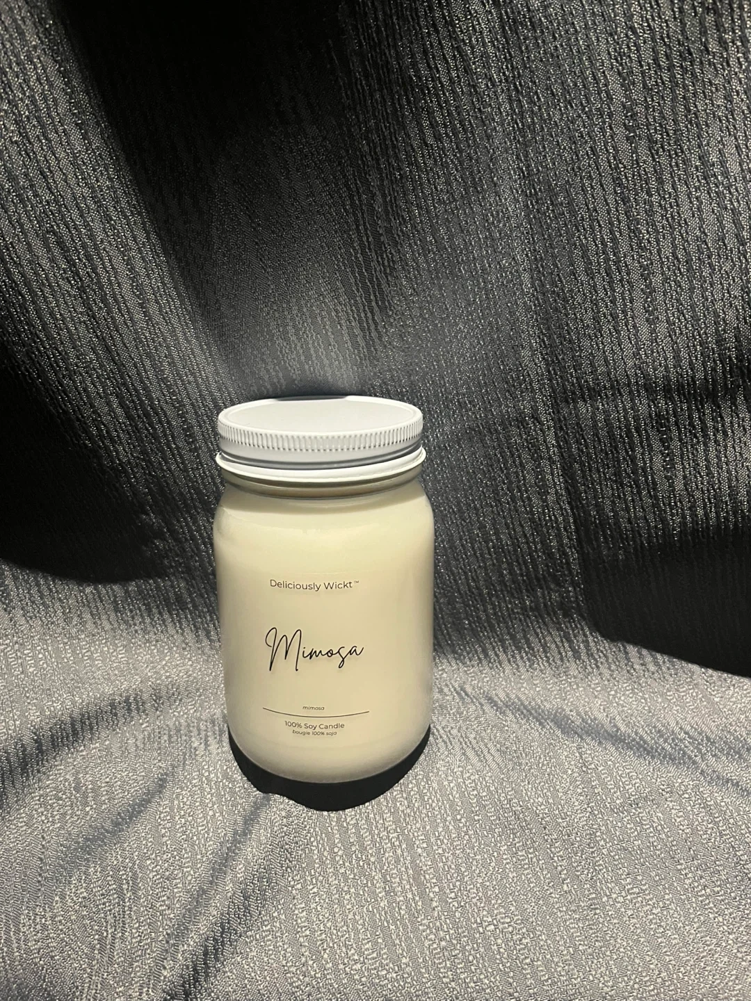 Selling a Deliciously Wickt Mimosa scented candle. It's a 100% soy candle, perfect for adding a fresh scent to your space