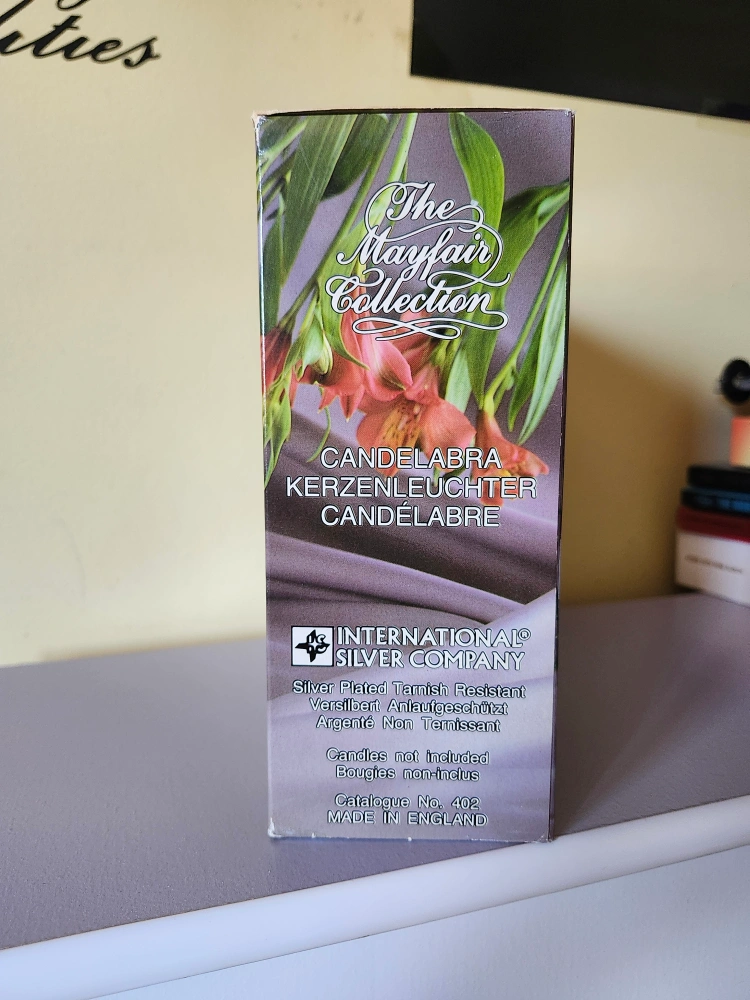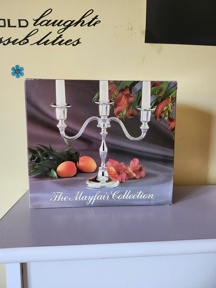 Brand new in packaging and original box Silver Plated Tarnish Resistant MAYFAIR Silver-plated Candelabra made in England New With Tag. Gorgeous silver-plated 3 arm candelabra, new with tags. Intricate details, twisted arm details and beautifully shiny. Made in England. Approximately 8.5 inches tall and 8.5 inches across. Love the beaded look details. Ready to become a treasured heirloom in your home