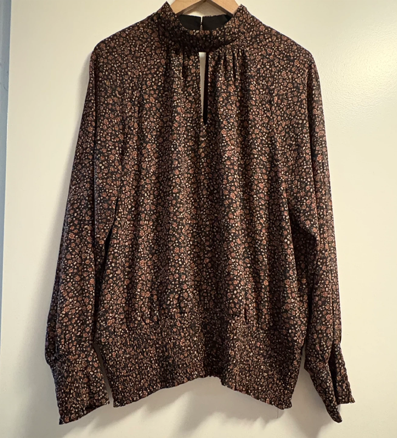 This is a long sleeve blouse with a dark floral print. It has a high neckline with a small slit at the front and a fitted, elasticized waist. The material appears lightweight and comfortable, perfect for layering or wearing on its own