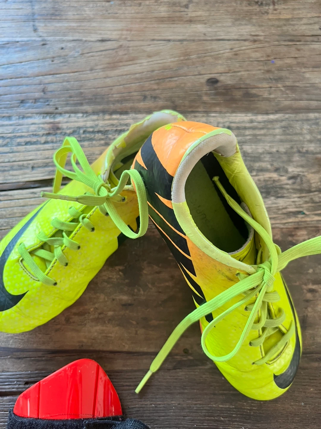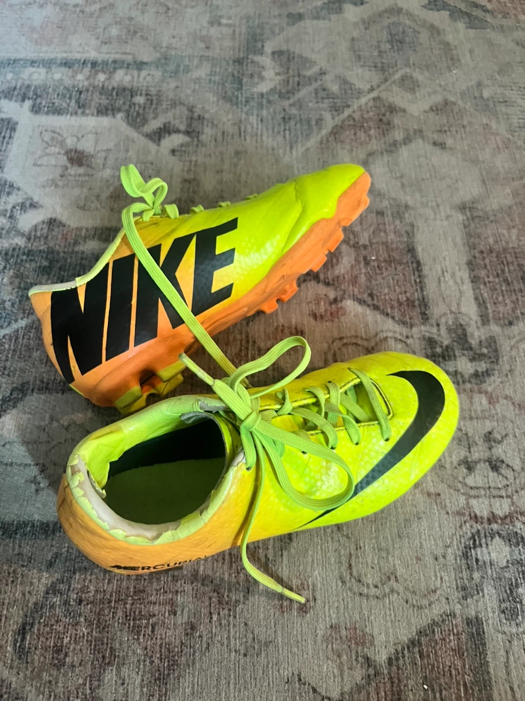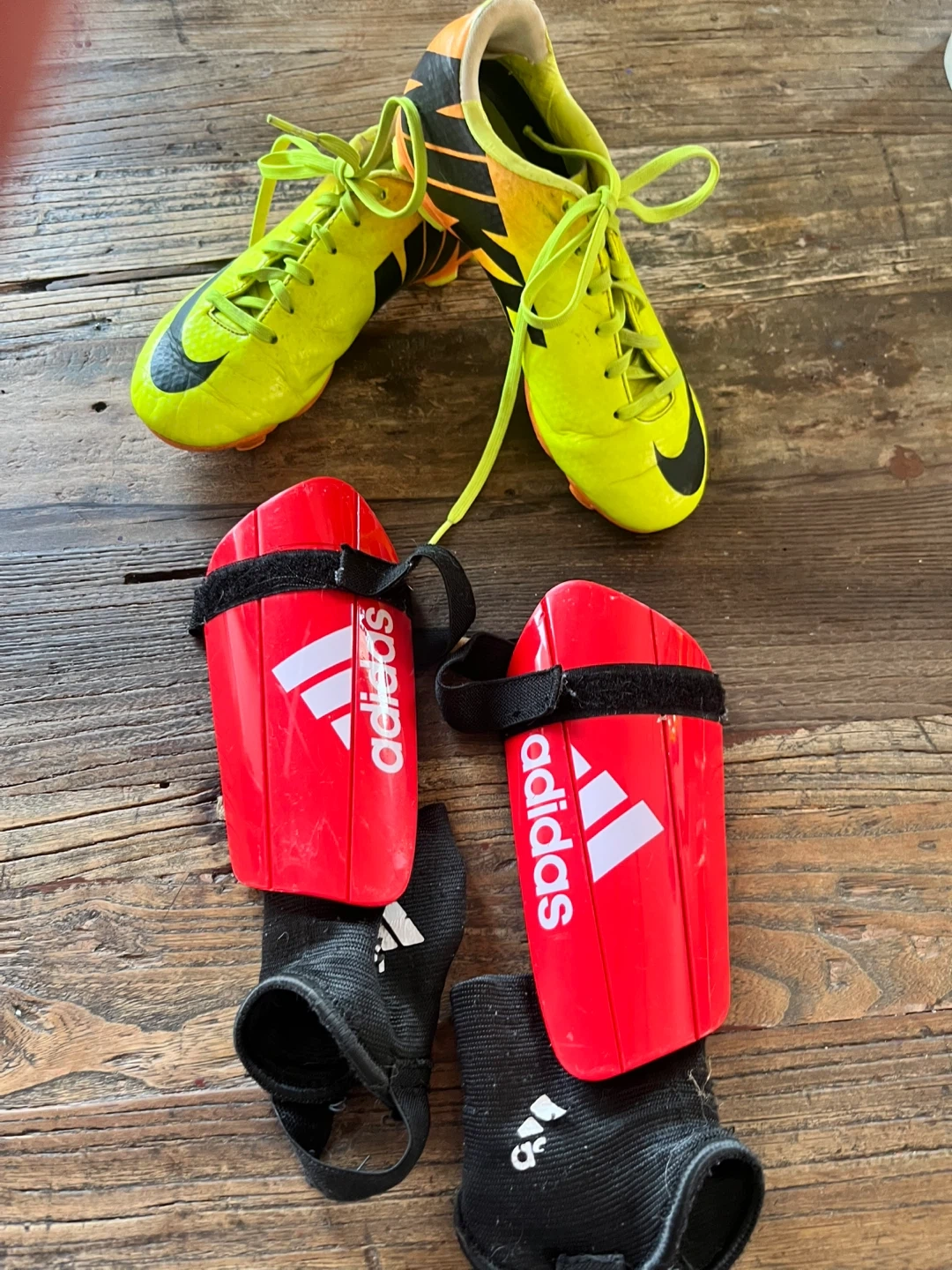 Selling a pair of Nike Mercurial soccer cleats in a vibrant yellow and orange colour combo! Size 1y. One shoe shows some signs of wear, but the boots themselves are still in great condition. Also included are a pair of Adidas shin guards.
