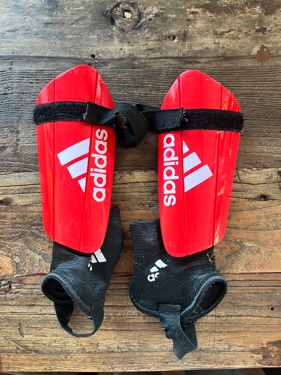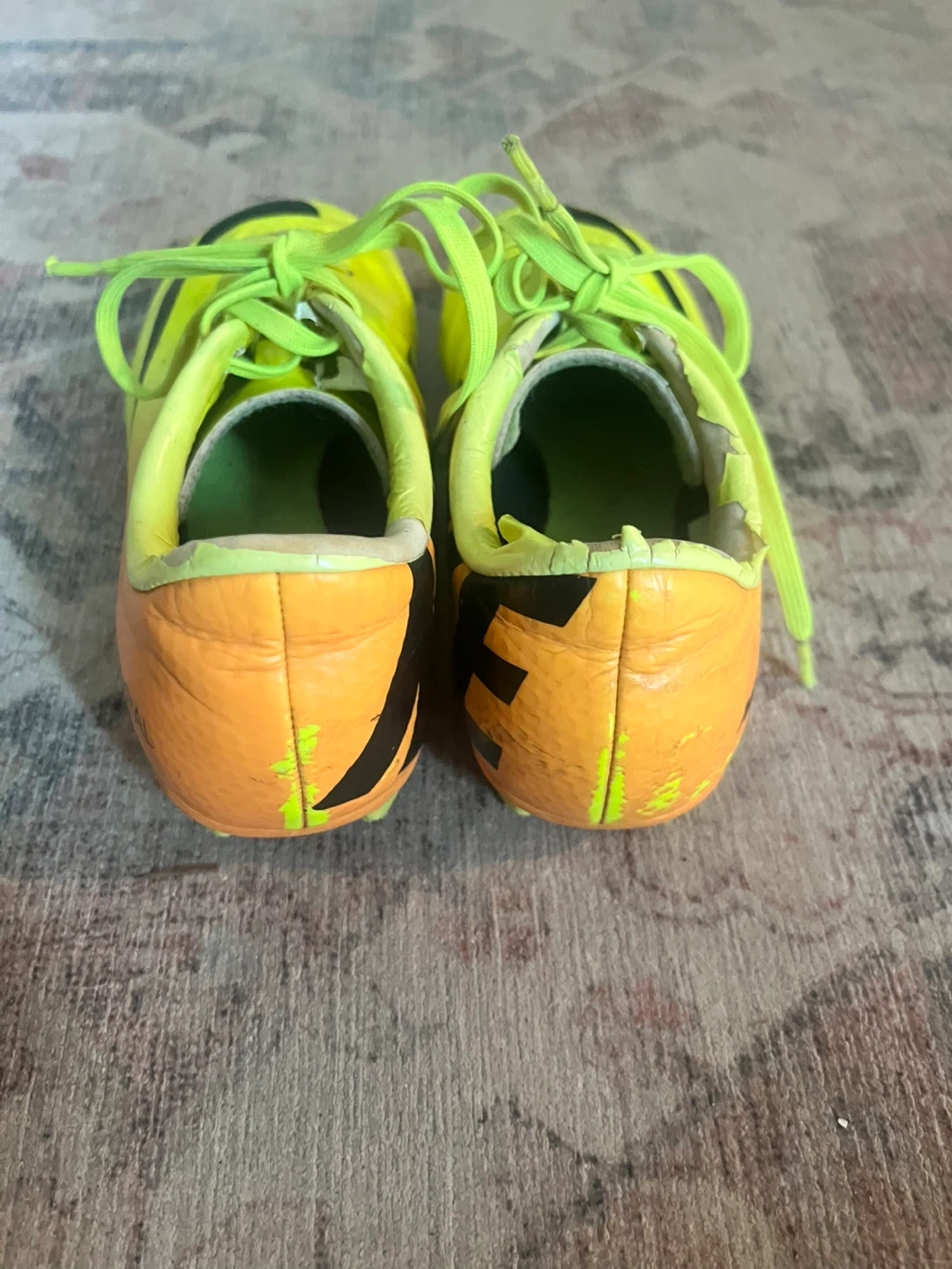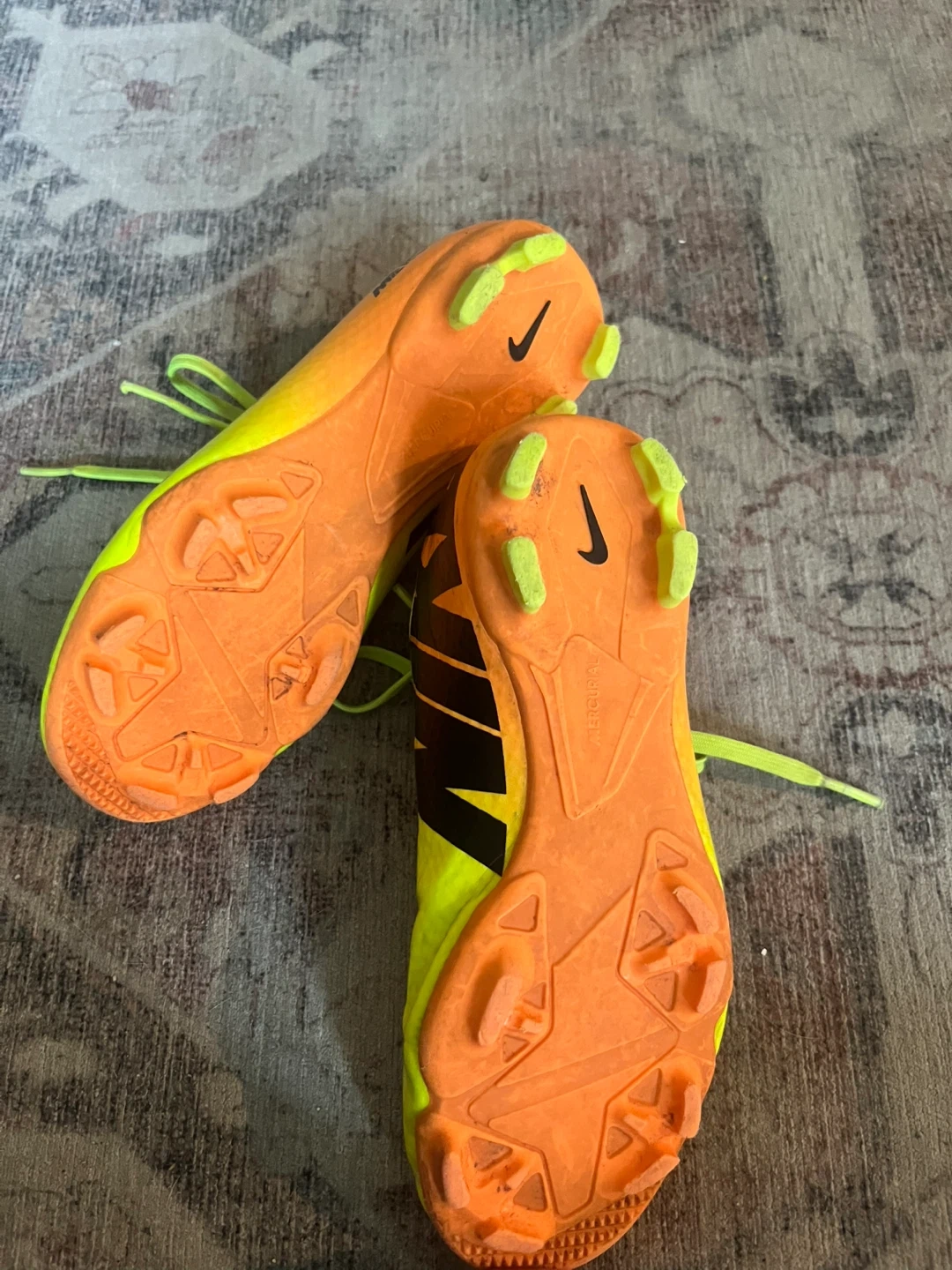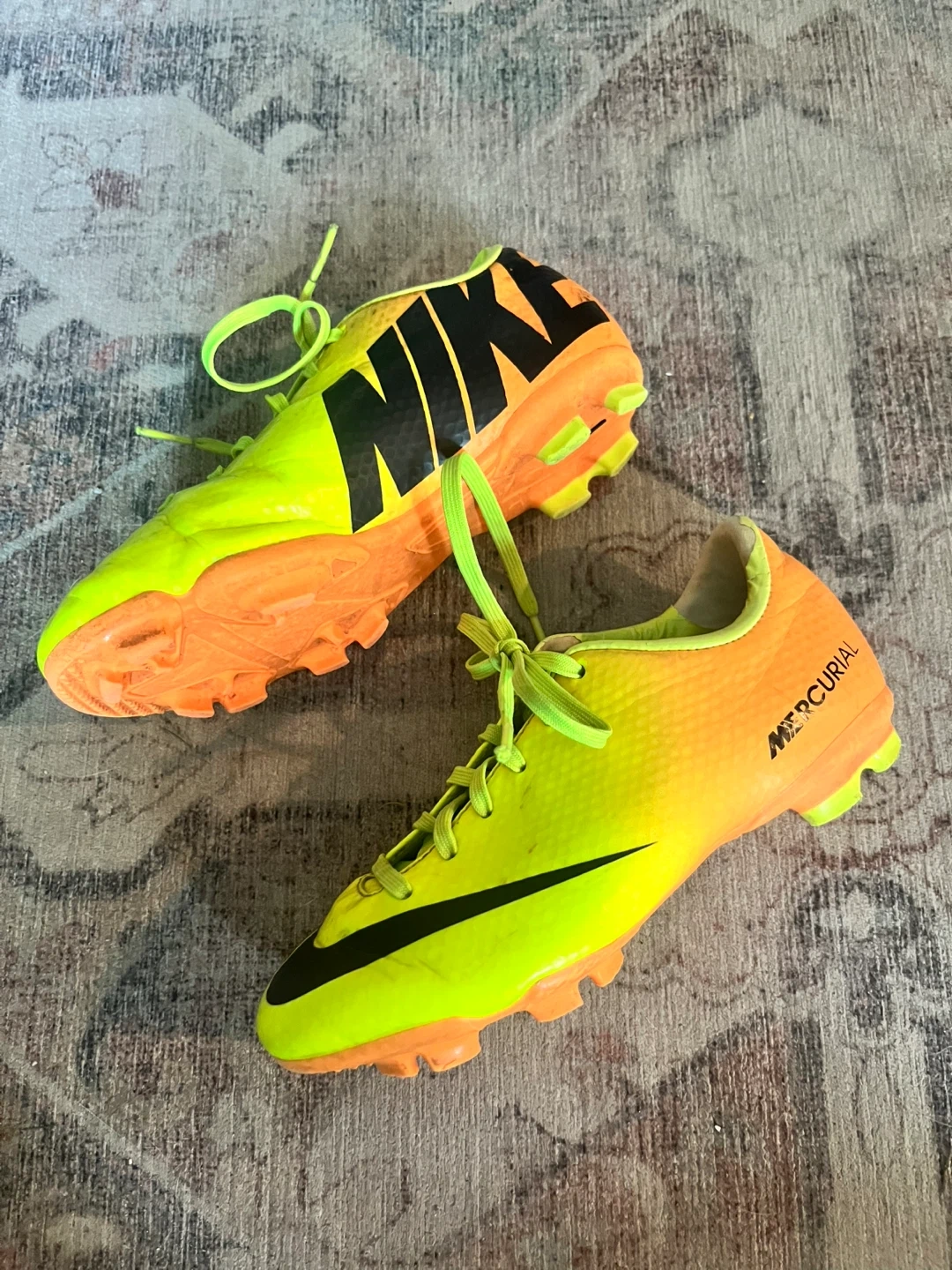 Selling a pair of Nike Mercurial soccer cleats in a vibrant yellow and orange colour combo! Size 1y. One shoe shows some signs of wear, but the boots themselves are still in great condition. Also included are a pair of Adidas shin guards.