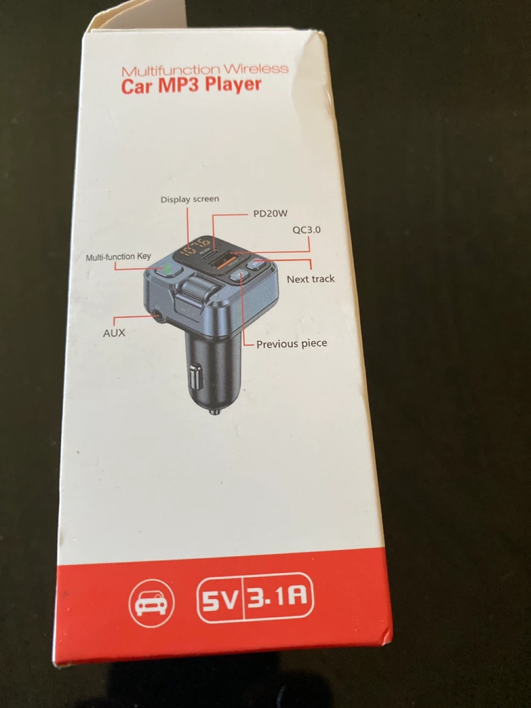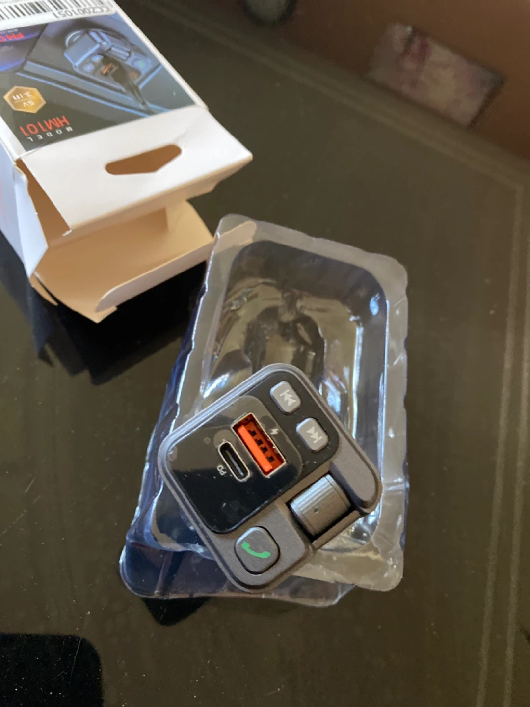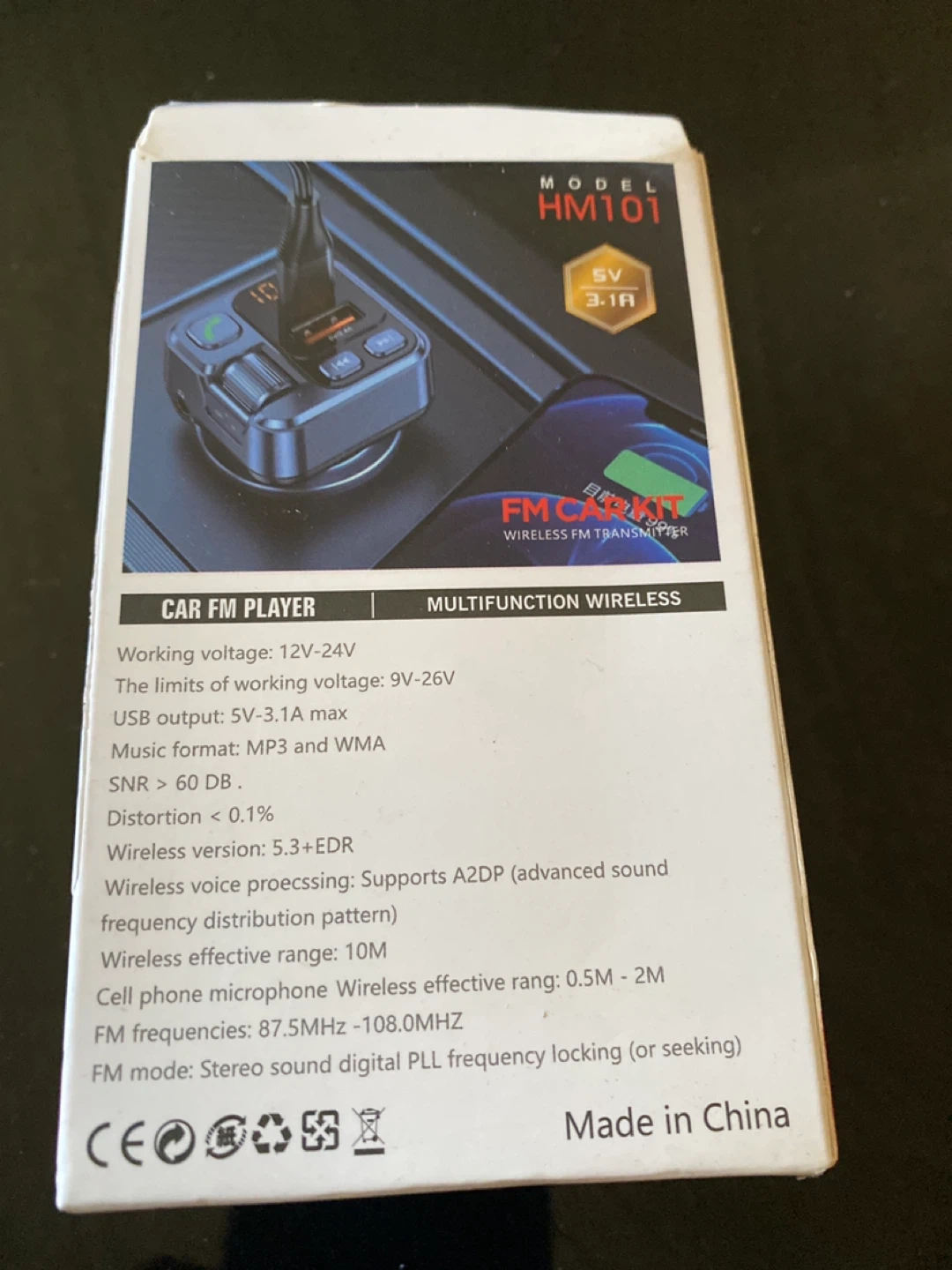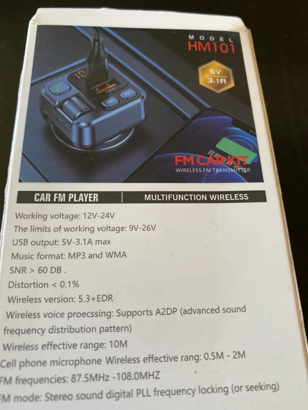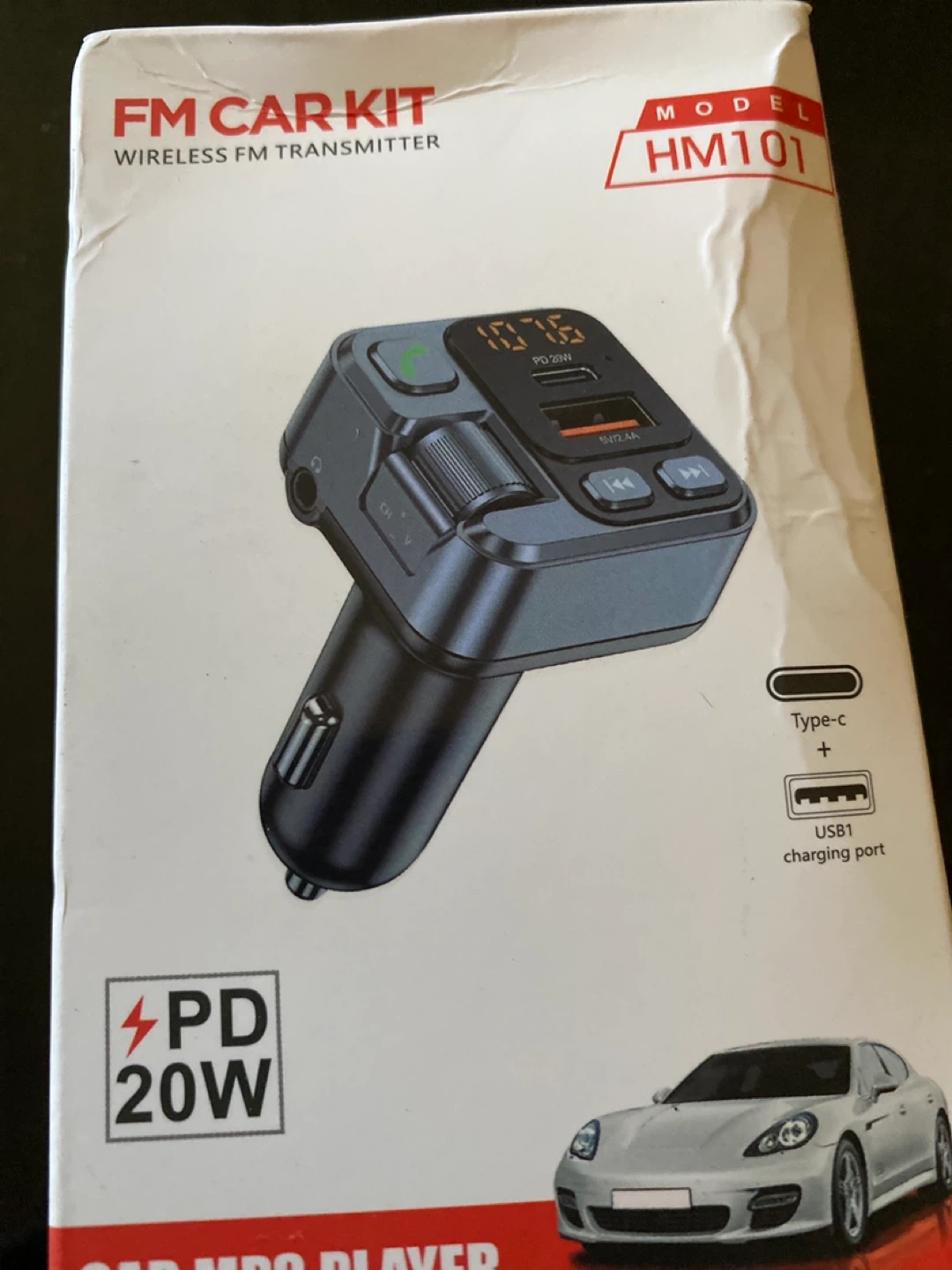 Selling a brand new FM Car Kit wireless FM transmitter, model HM101. It features a Type-C and USB1 charging port. It also has a display screen, multi-function key, AUX, next track, and previous piece buttons. Works with a working voltage of 12V-24V, and has a wireless range of 10M
