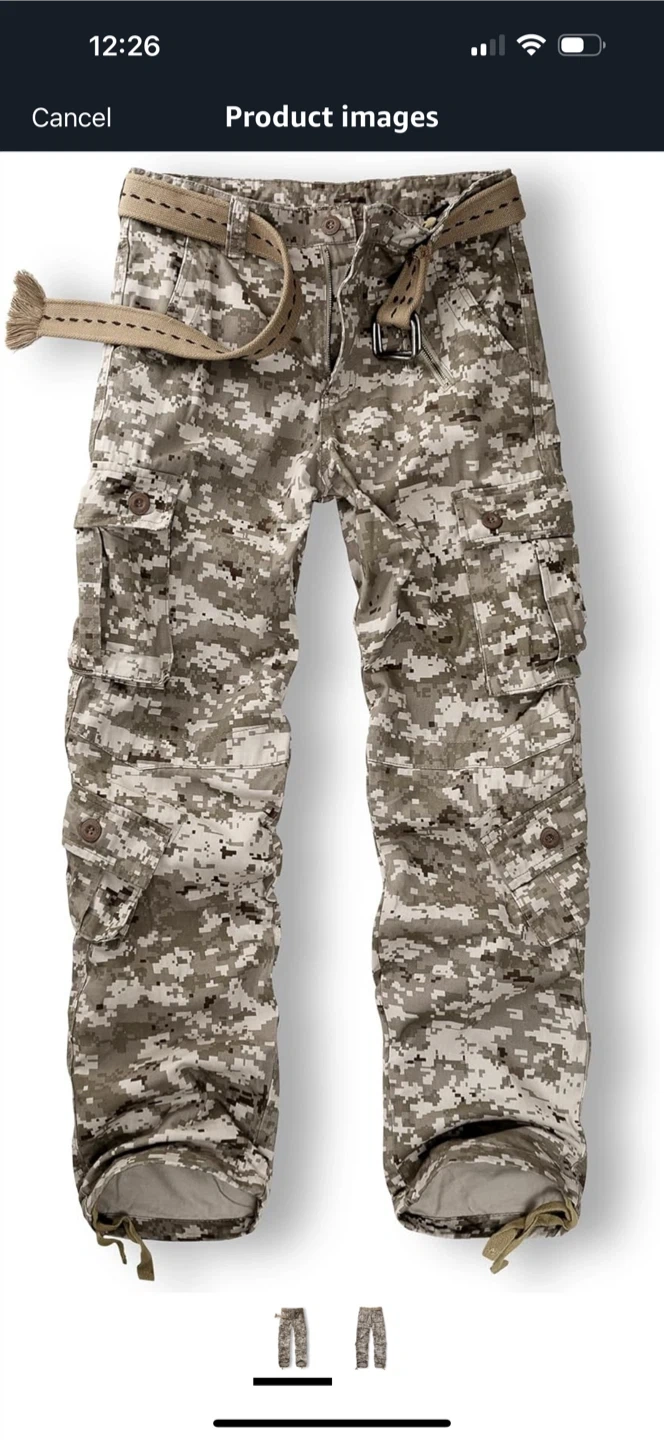 Selling a pair of camo cargo pants that come with a belt. They have a cool, rugged look and are perfect for casual wear or outdoor activities. Lots of pockets for storage too!