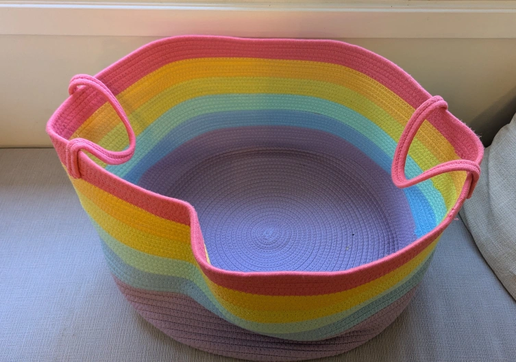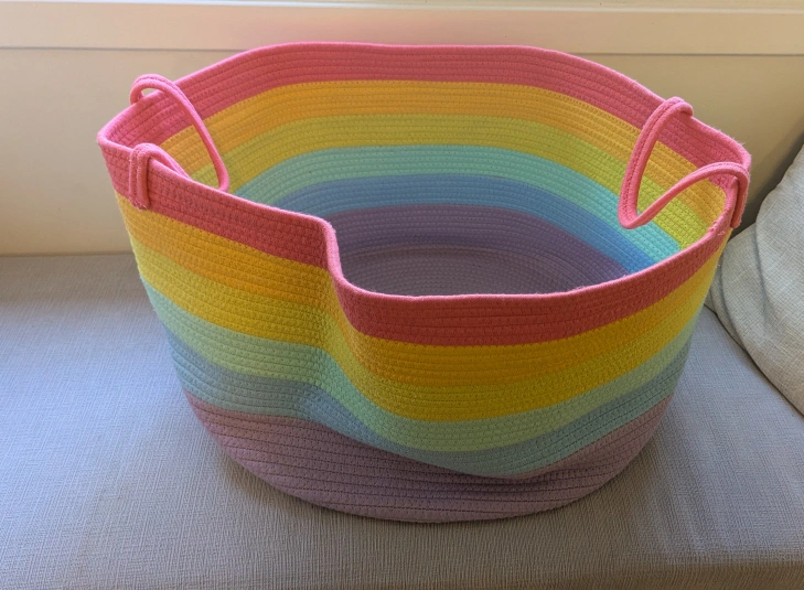 Add a pop of colour to your space with this vibrant rainbow cotton rope basket! It's perfect for storing toys, blankets, or laundry. The sturdy handles make it easy to move around, and the soft cotton rope is gentle on your belongings