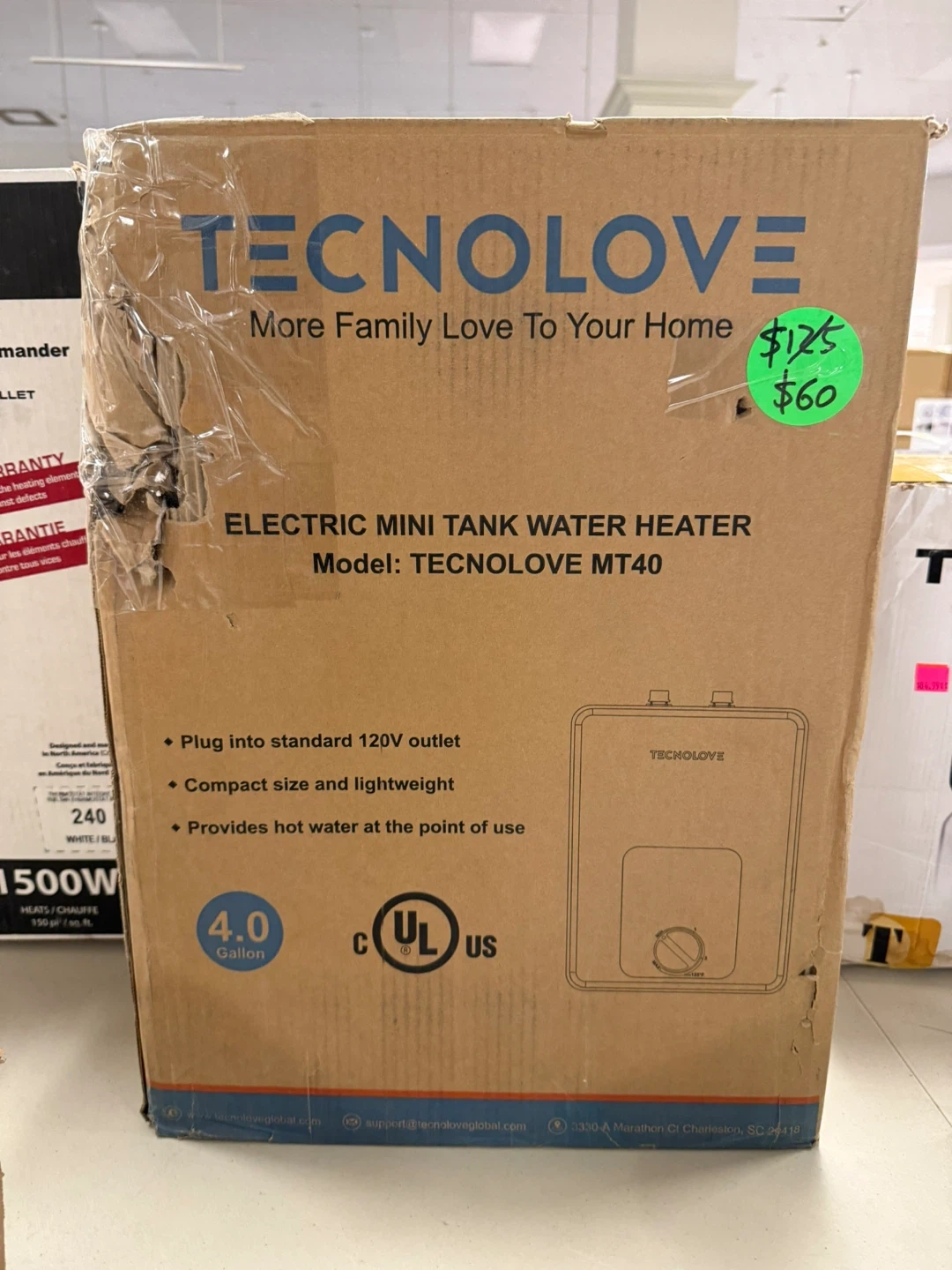 Selling a Tecnolove MT40 electric mini tank water heater. It's a 4.0-gallon tank that plugs into a standard 120V outlet. It's compact, lightweight, and provides hot water at the point of use. The original price was $125, but I'm selling it for $60!