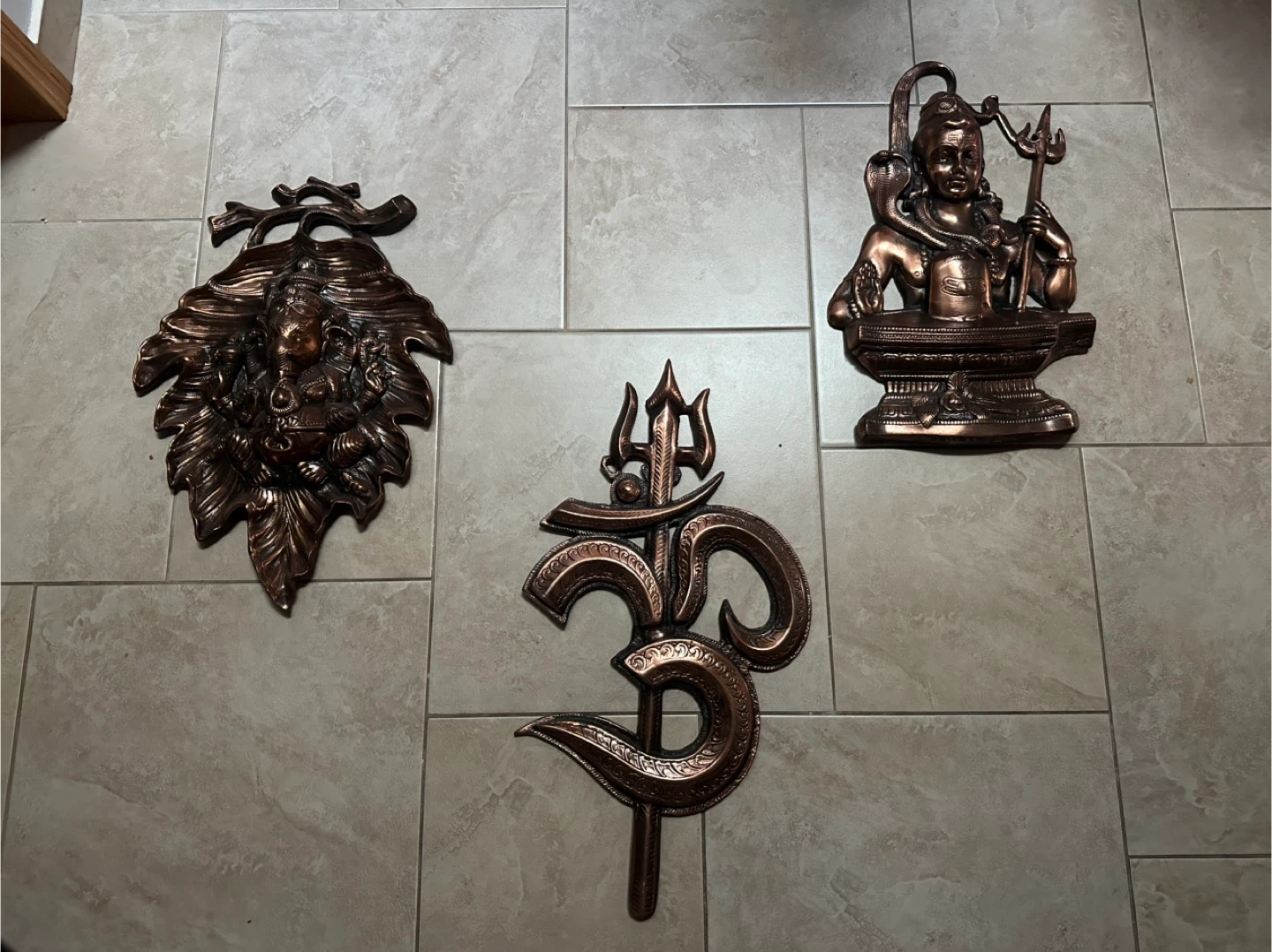 Selling a set of Hindu religious wall art pieces. These are beautiful bronze-coloured decorative items. Perfect for adding a spiritual touch to your home decor! Selling each piece for $50 or all 3 for $130.