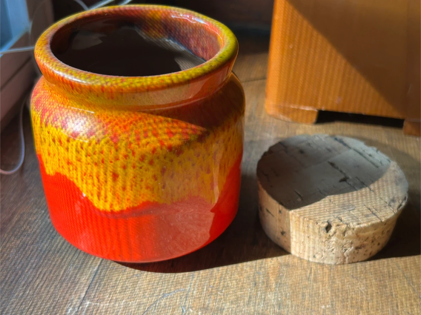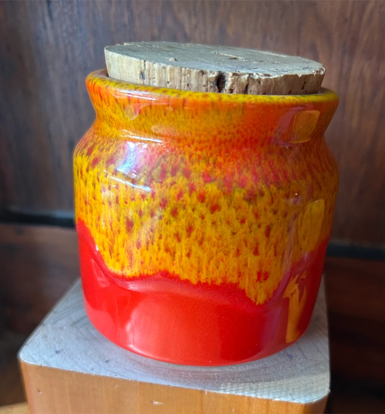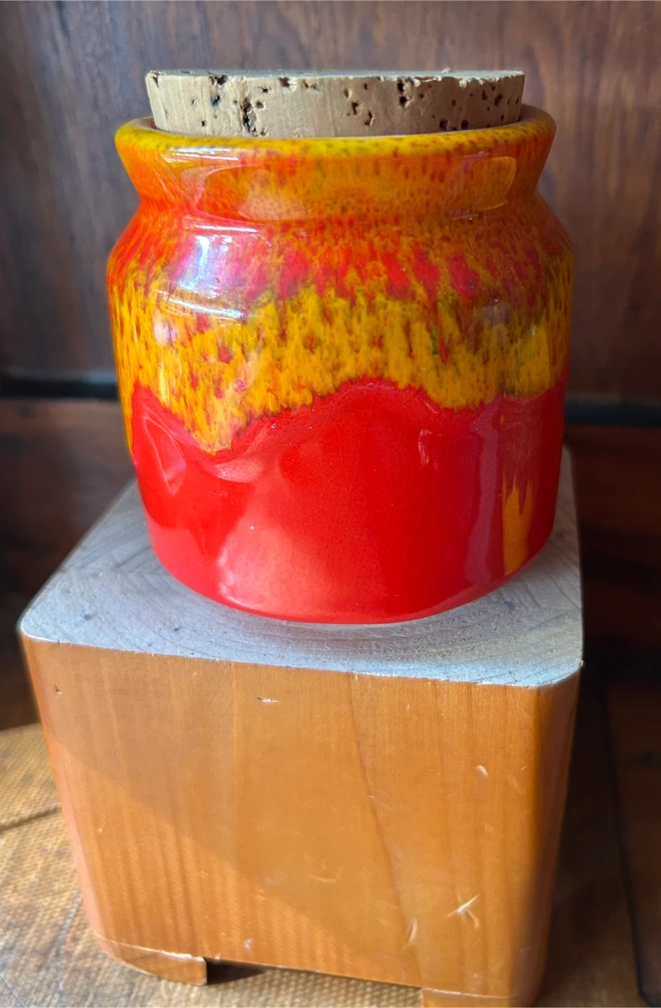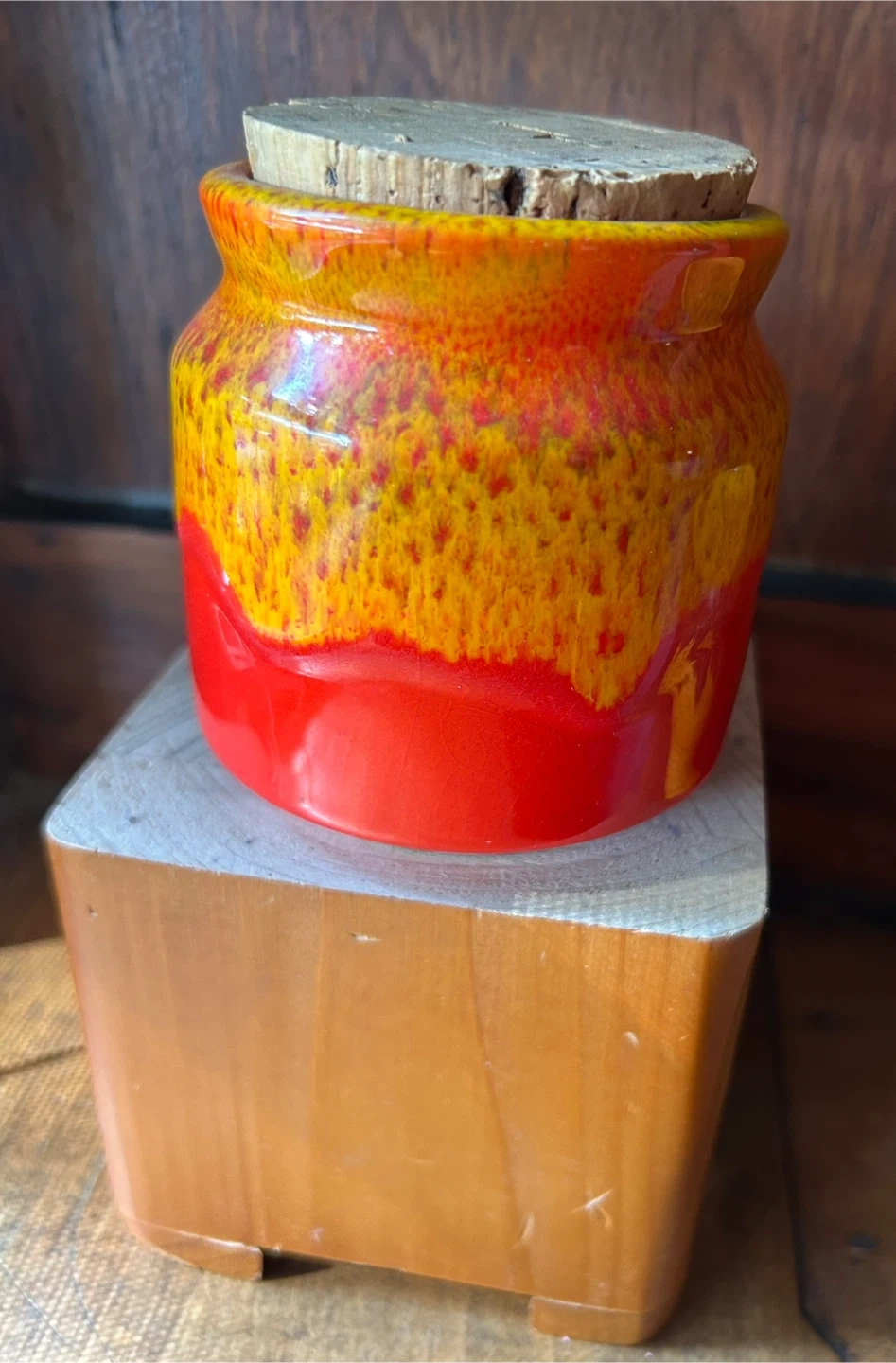 Orange yellow Honey Pot Meadowcroft Sandy Metcalfe Canadian Art Pottery vintage MCM Canada fat lava 25.00 Very good condition and with original cork top Canadian antique vintage delicious honey pot These colors pop and the glaze looks like honey dripping on a pot Meadowcroft Pottery was born from a beekeeper who needed pots to sell his honey. Sandy Metcalfe a Canadian potter from Mississauga Ontario Canada, fell in love with the craft and soon began creating all kinds of dishes and vessels with his fabulous bright drip glazes. Pot stands approximately 4” tall. Add a pop of colour to your decor with this lovely honey pot by Sandy Metcalfe. A rare find, and it’s in great vintage condition with no chips or cracks. This pot has a cork lid that is in good condition. Gorgeous drip glaze 25.00 Flexible re pickup Elmsdale Road M4J 3M3 Donlands O'Connor East York Don Mills south exit off DVP