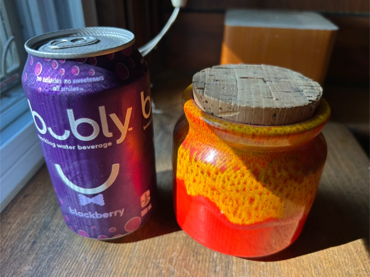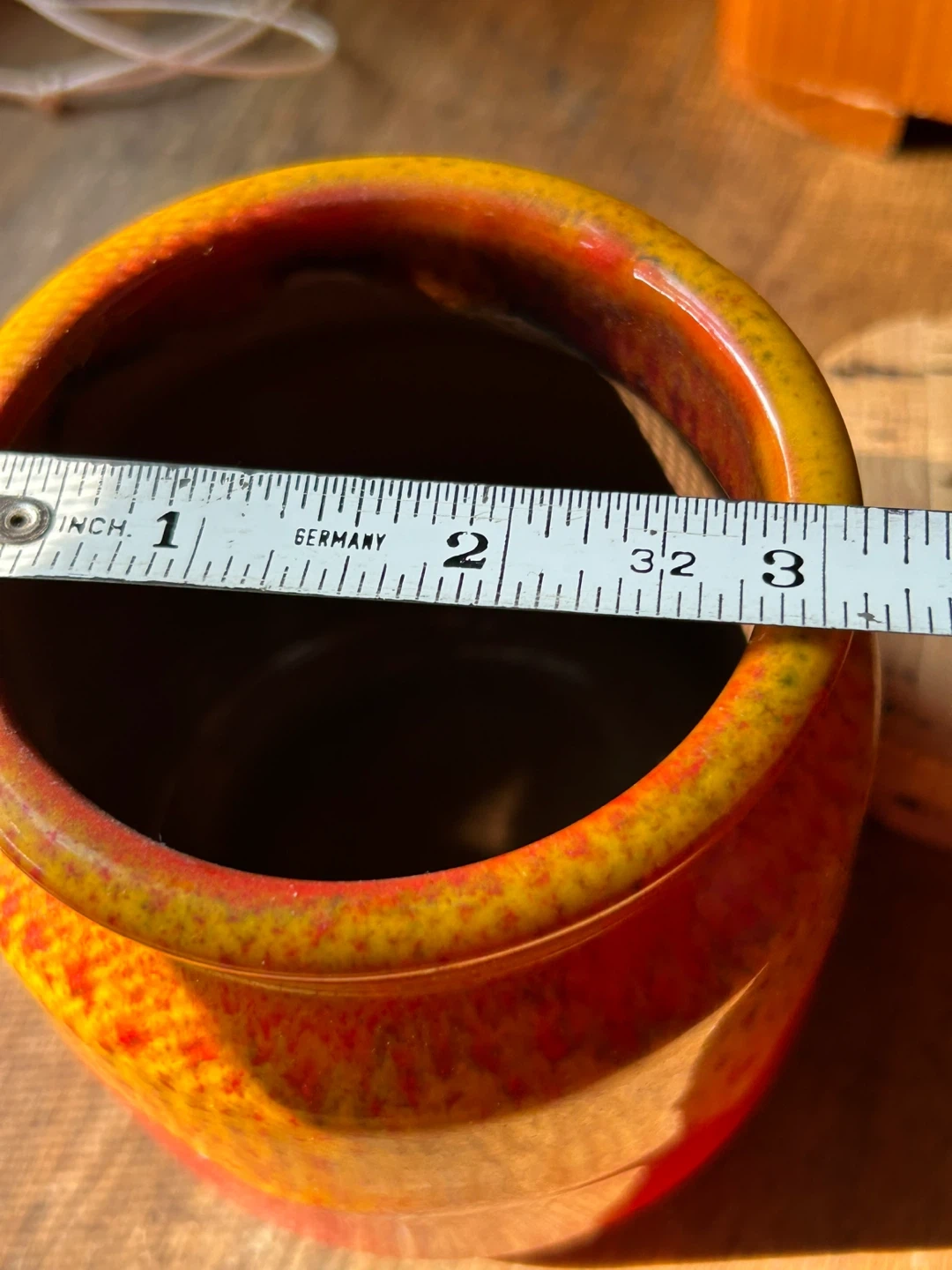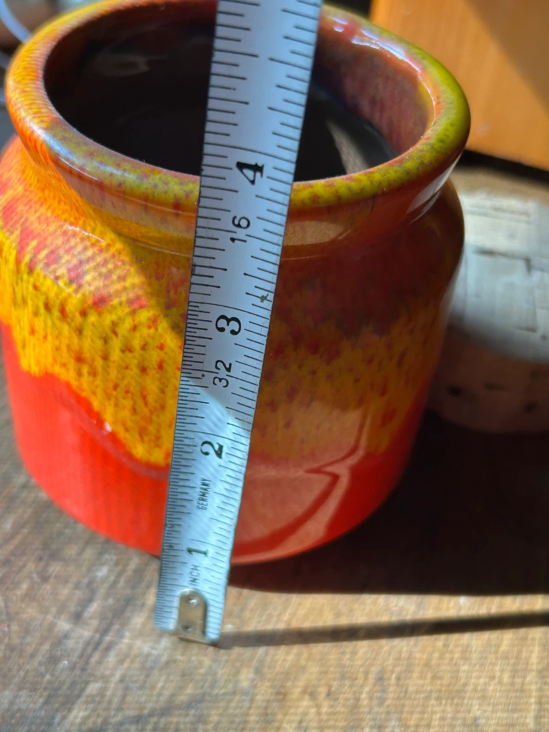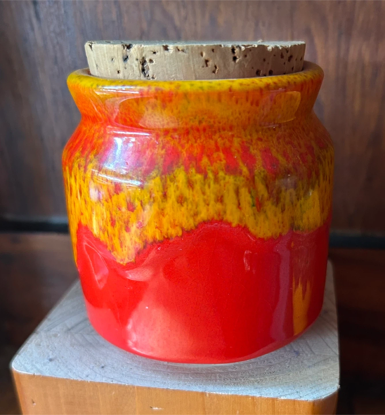 Orange yellow Honey Pot Meadowcroft Sandy Metcalfe Canadian Art Pottery vintage MCM Canada fat lava 25.00 Very good condition and with original cork top Canadian antique vintage delicious honey pot These colors pop and the glaze looks like honey dripping on a pot Meadowcroft Pottery was born from a beekeeper who needed pots to sell his honey. Sandy Metcalfe a Canadian potter from Mississauga Ontario Canada, fell in love with the craft and soon began creating all kinds of dishes and vessels with his fabulous bright drip glazes. Pot stands approximately 4” tall. Add a pop of colour to your decor with this lovely honey pot by Sandy Metcalfe. A rare find, and it’s in great vintage condition with no chips or cracks. This pot has a cork lid that is in good condition. Gorgeous drip glaze 25.00 Flexible re pickup Elmsdale Road M4J 3M3 Donlands O'Connor East York Don Mills south exit off DVP