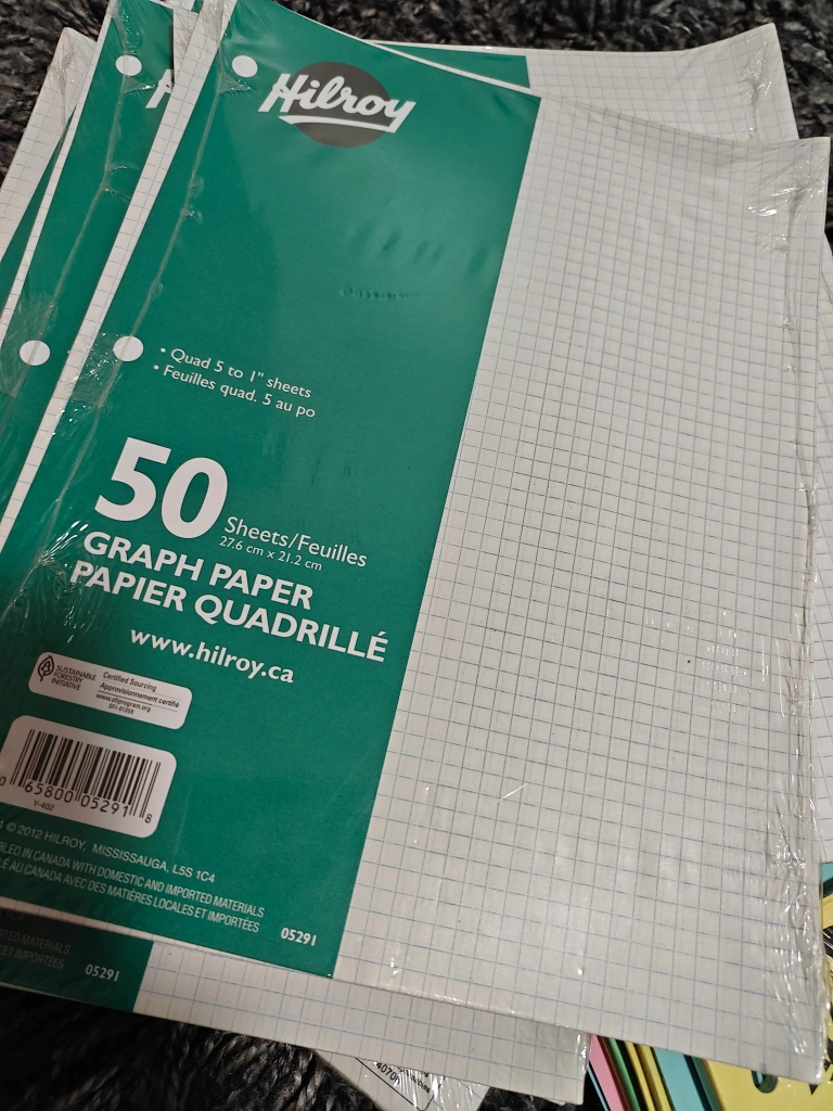 Selling a pack of Hilroy graph paper. It contains 50 sheets of graph paper, quad ruled 5 to 1". Each sheet measures 27.6 cm x 21.2 cm. Great for school or office use! price for each
