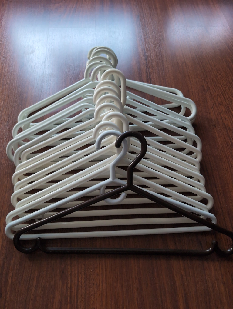 Selling a bundle of clothes hangers! There are white plastic hangers and one brown hanger in the mix. Great for organizing your closet or hanging up laundry to dry