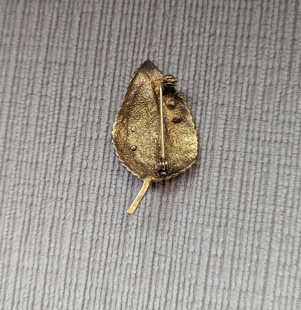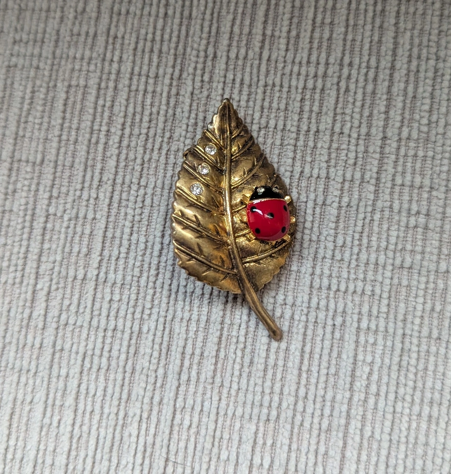Selling a cute leaf-shaped brooch with a little ladybug! It's gold-toned and has some sparkly accents. Perfect for adding a touch of whimsy to your outfit