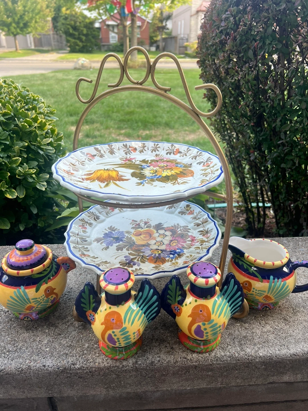 Unique, handpainted La Paloma Pelzman Design set! Includes a two-tiered serving stand, a teapot, creamer, and adorable bird-shaped salt and pepper shakers. The vibrant colours and floral designs add a touch of whimsy to any table setting. Plates are hand painted in Italy!