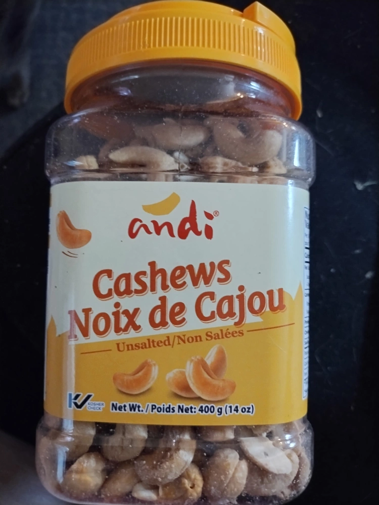 Selling a jar of Andi Cashews Noix de Cajou, unsalted. The jar contains 400g of cashews. The expiry date is 2025 December 24. sealed and stored in kitchen cupboard.