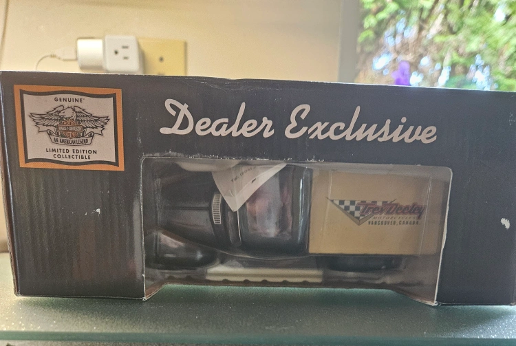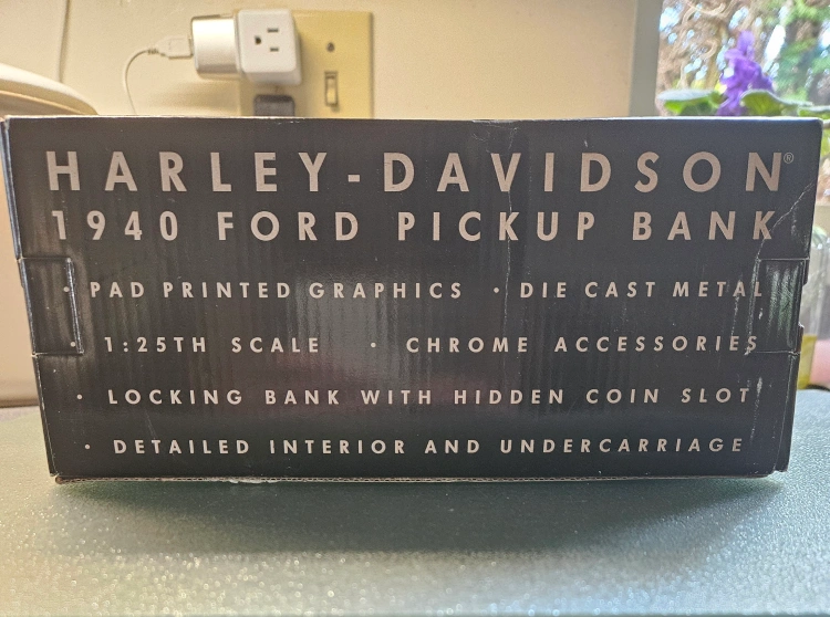 Selling a limited edition, genuine Harley-Davidson 1940 Ford Pickup Bank. It's a die-cast metal replica at 1:25th scale. It features pad-printed graphics, chrome accessories, a locking bank with a hidden coin slot, and a detailed interior and undercarriage. It's a dealer exclusive and an American legend collectible!