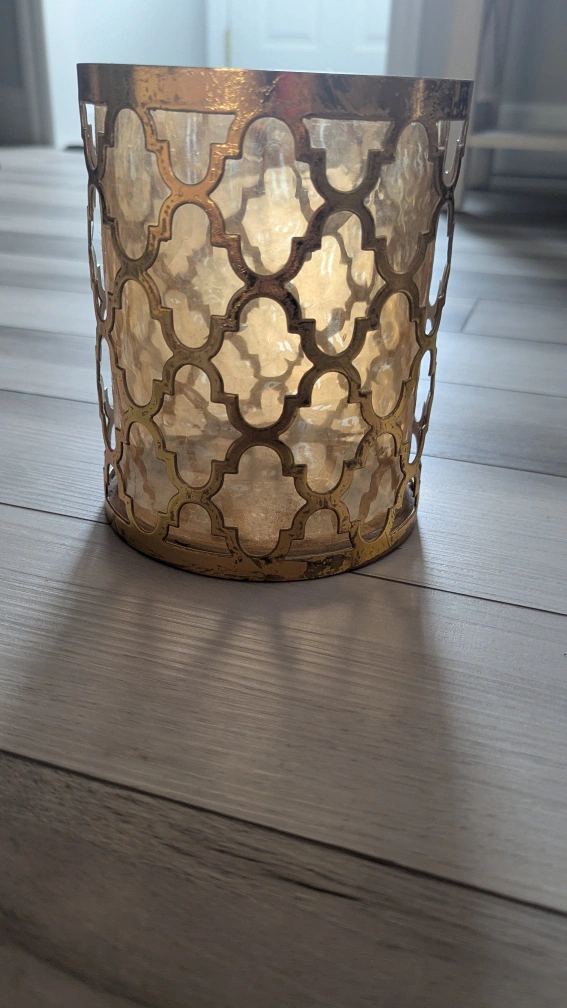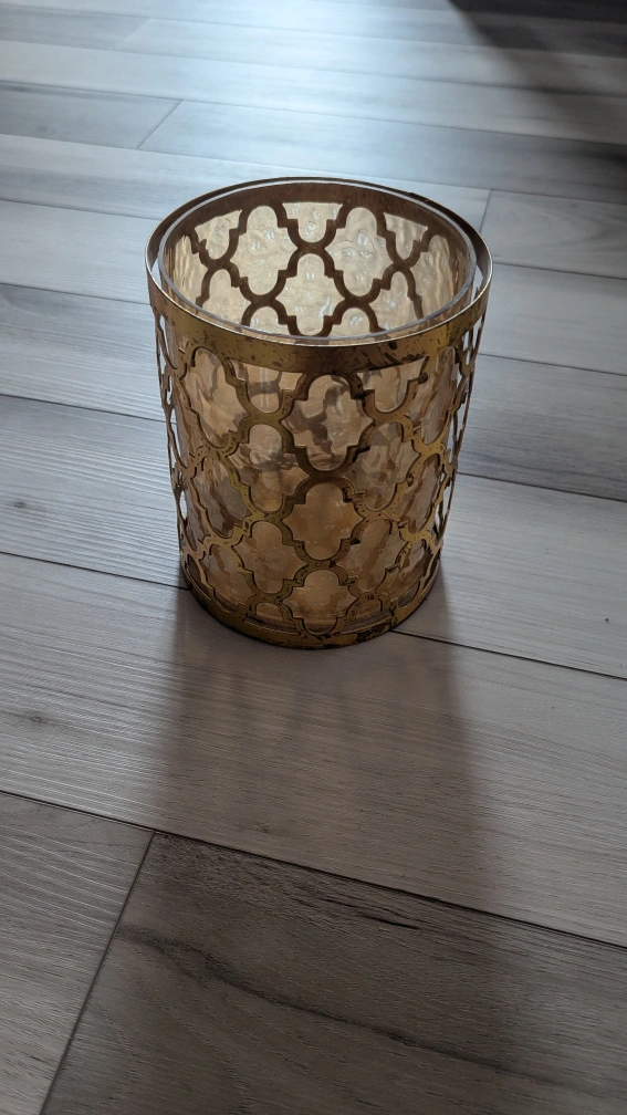 gold tone candle holder about 6 1/2 inches tall and 4 1/2 inches wide.