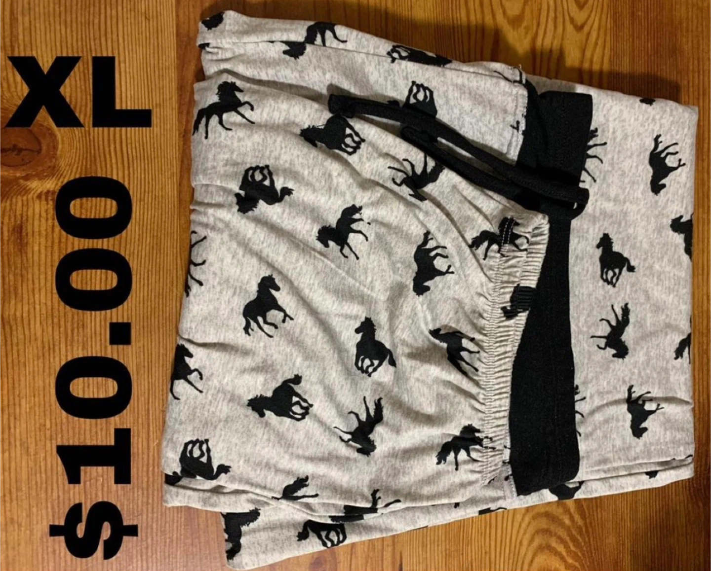 These are a pair of XL pajama pants with a horse print. They are light grey with black horses and black trim. Perfect for lounging around the house, very soft. Adjustable waistband. As is. $10.00 exact cash only Info in photo