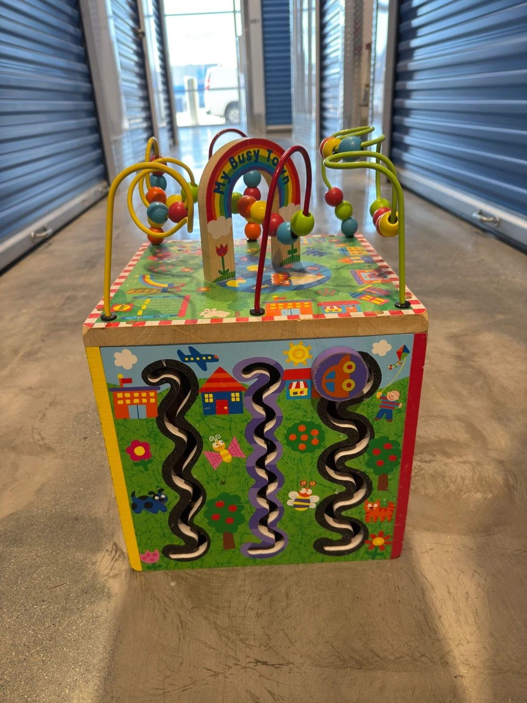 This is a colourful wooden activity cube, perfect for toddlers! It features a bead maze on top and different activities on each side of the cube, including letter blocks, sliding doors, and more! It's in good used condition and ready for a new home