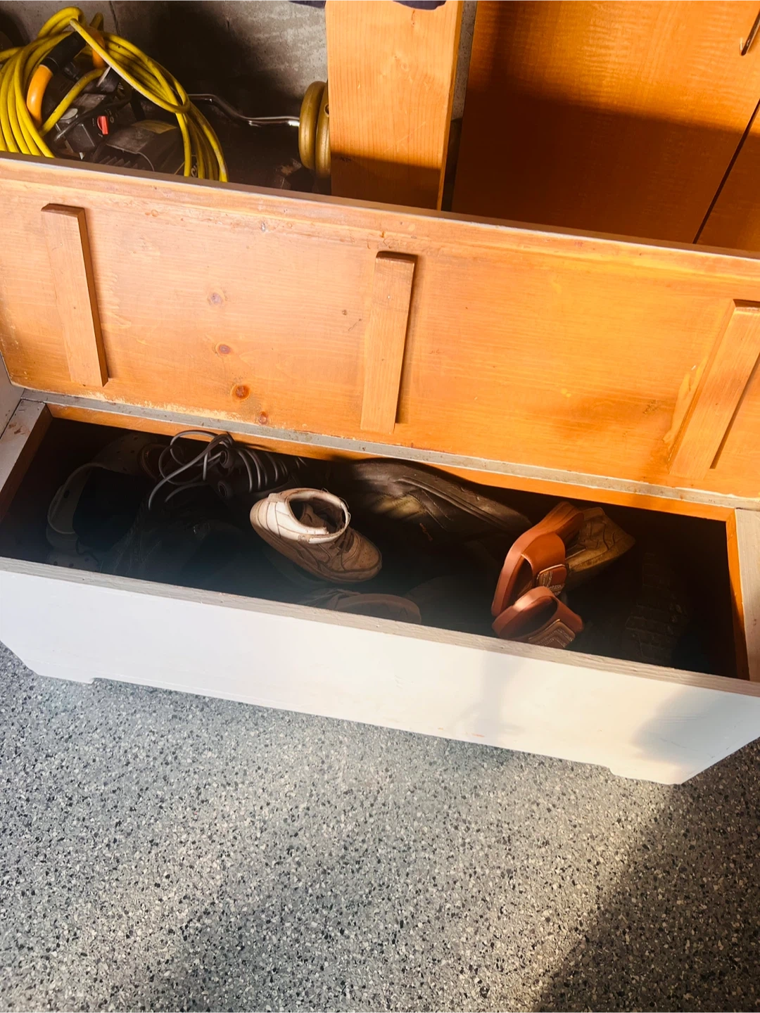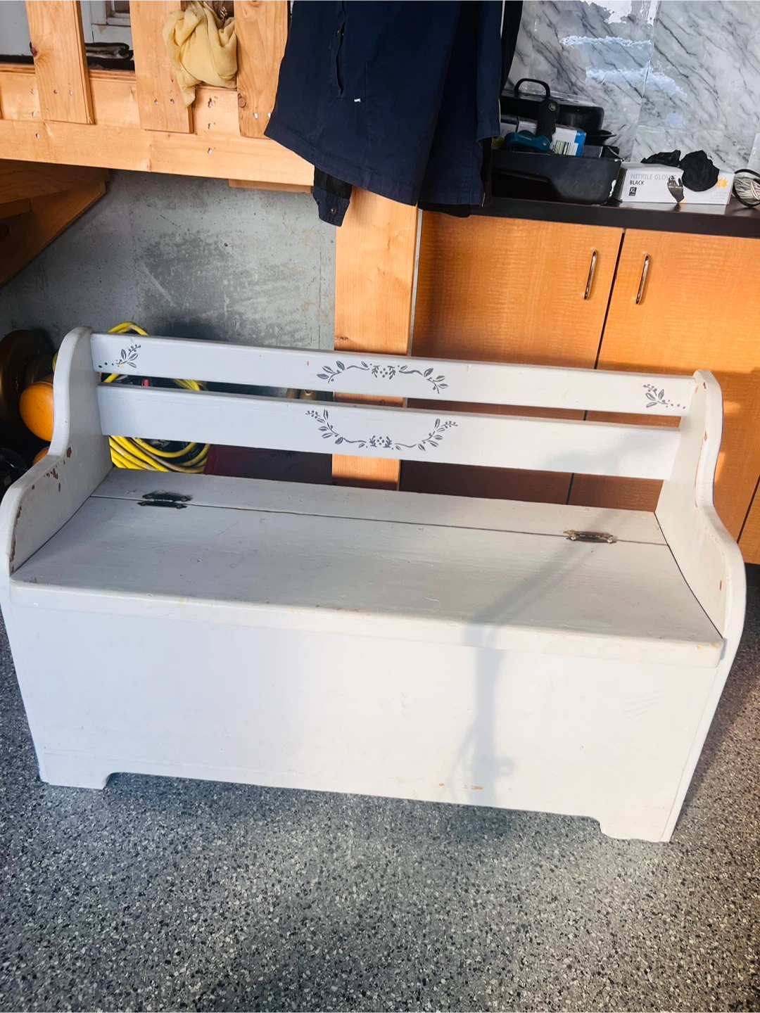 Selling a white wooden storage bench! It's perfect for storing shoes, blankets, or toys. It has a hinged lid for easy access and a cute design on the back. Would look great in an entryway or mudroom