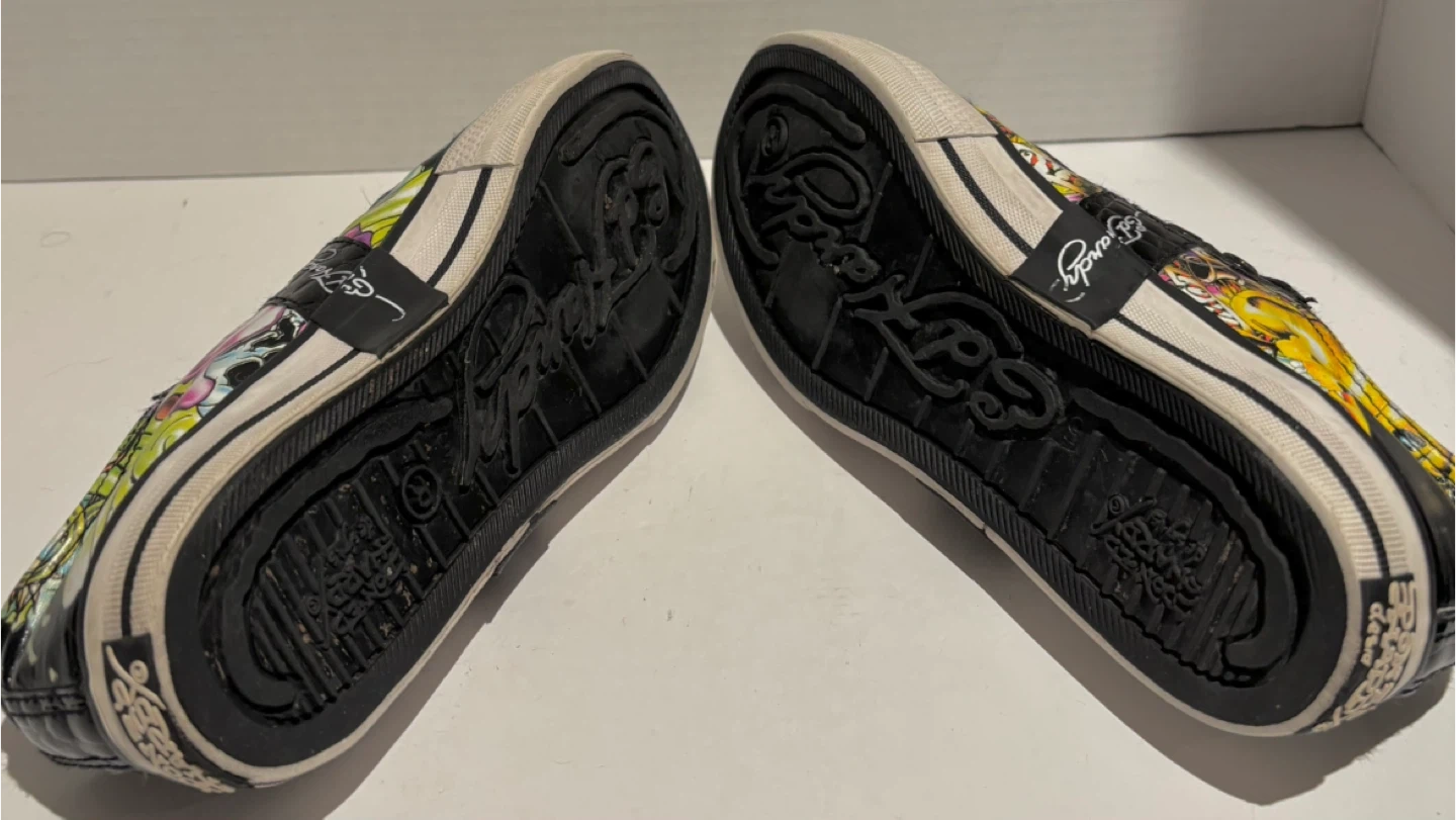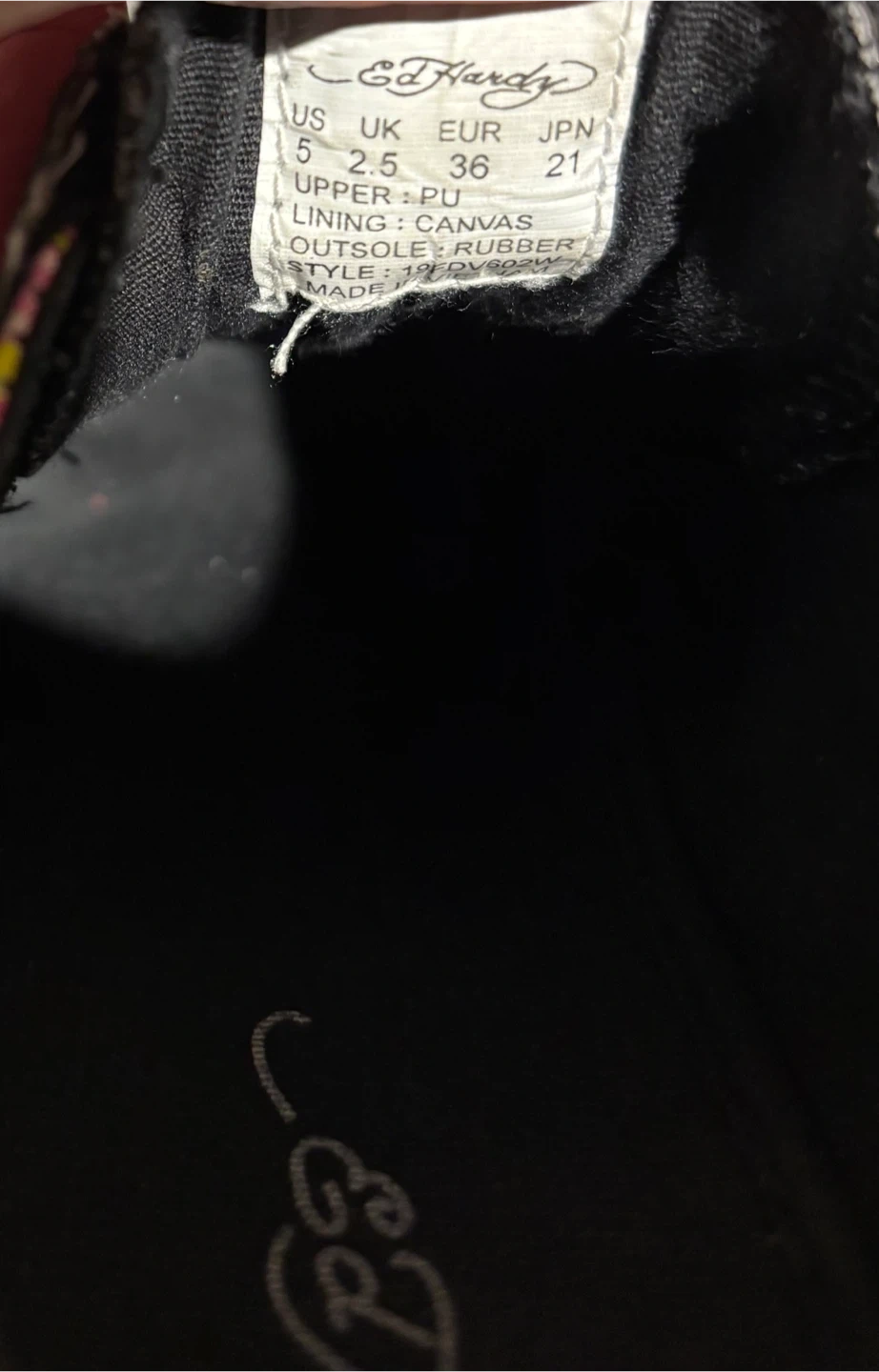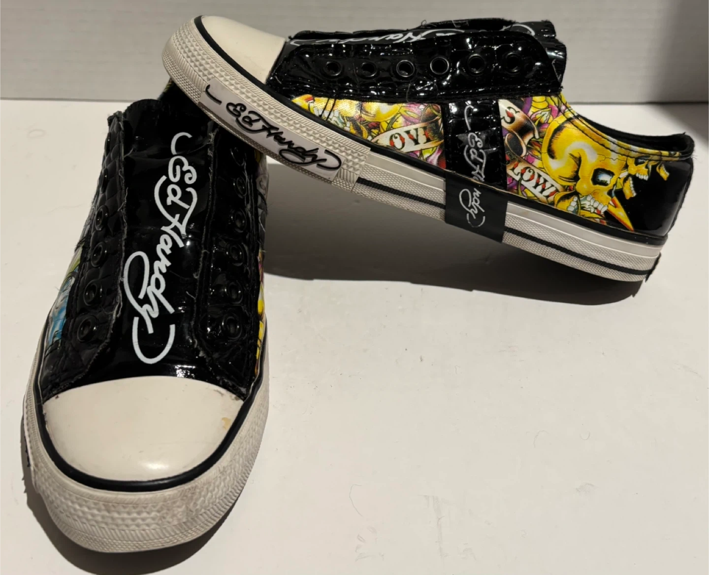 Ed Hardy low top sneakers in a size 5. The upper is made of PU and the lining is canvas with a rubber outsole. These shoes feature a unique graphic design on a glossy black background. Check out the photos for details!