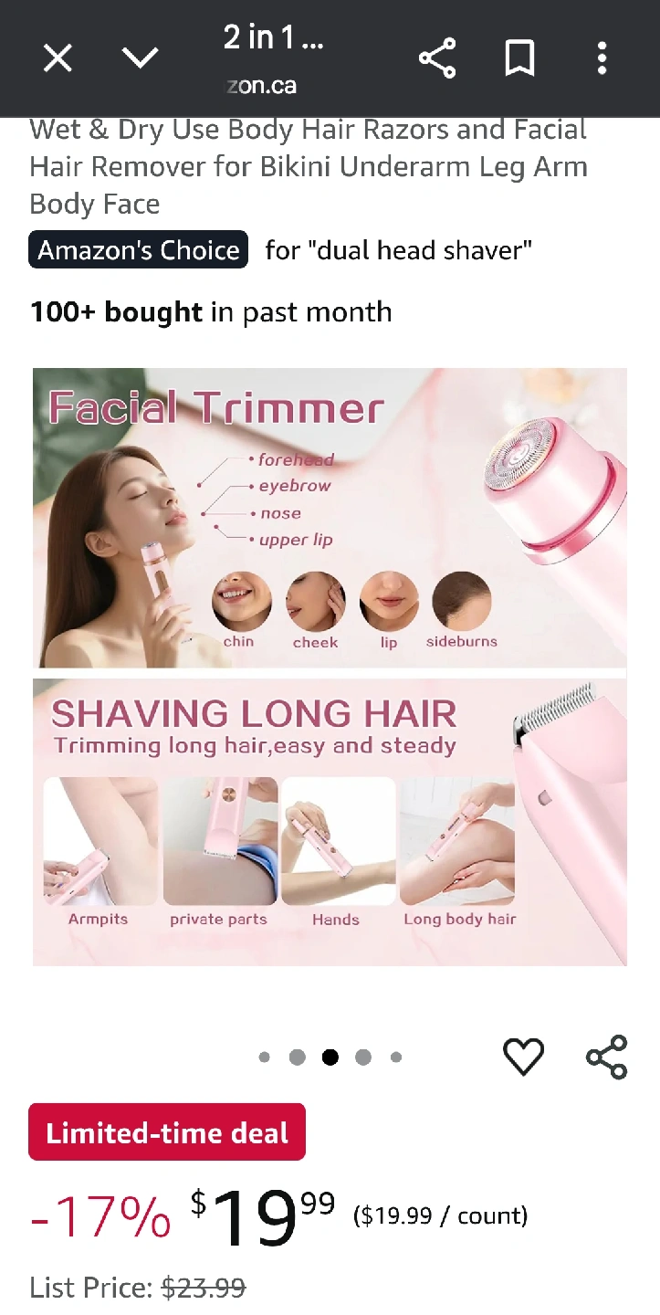 I'm selling a 2 in 1 wet & dry body hair razor and facial hair remover. It's great for bikini, underarm, leg, arm, body, and face hair removal. It's an Amazon's Choice product for dual head shavers. The list price is $23.99, but it's currently on sale for $19.99! my price is $8 New never used.