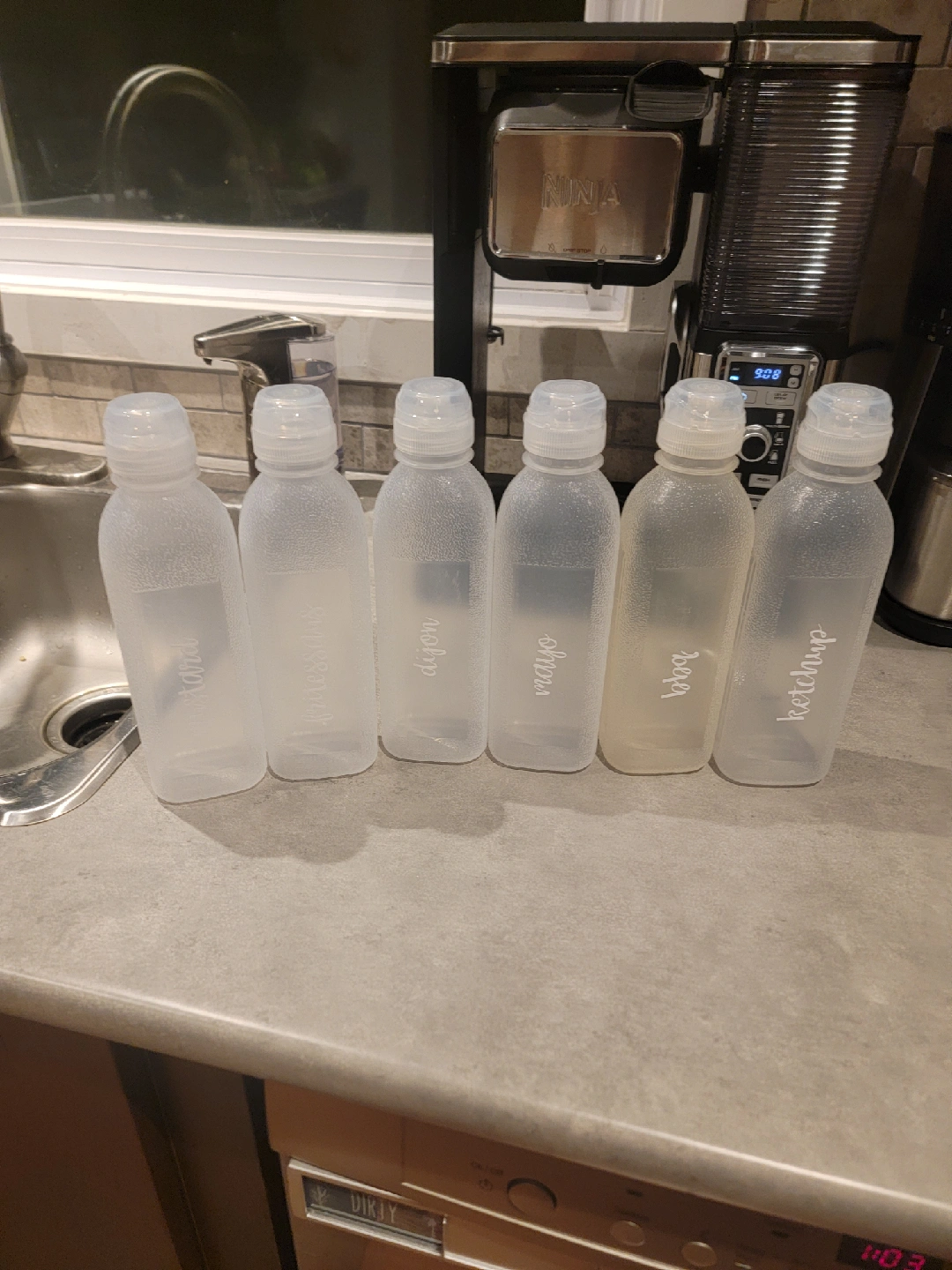 Selling a set of six condiment bottles. Labels are removable'. Perfect for organizing your fridge or pantry!