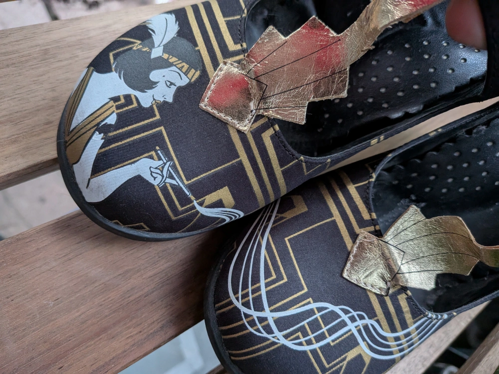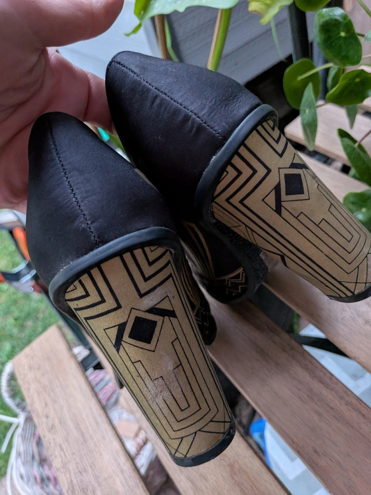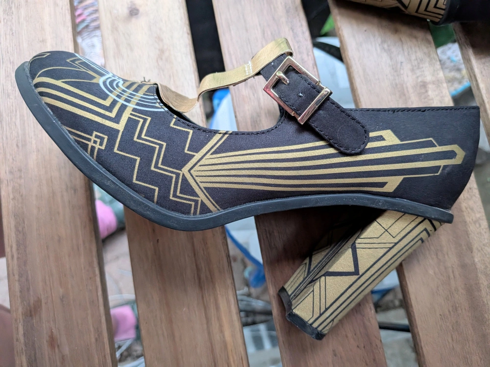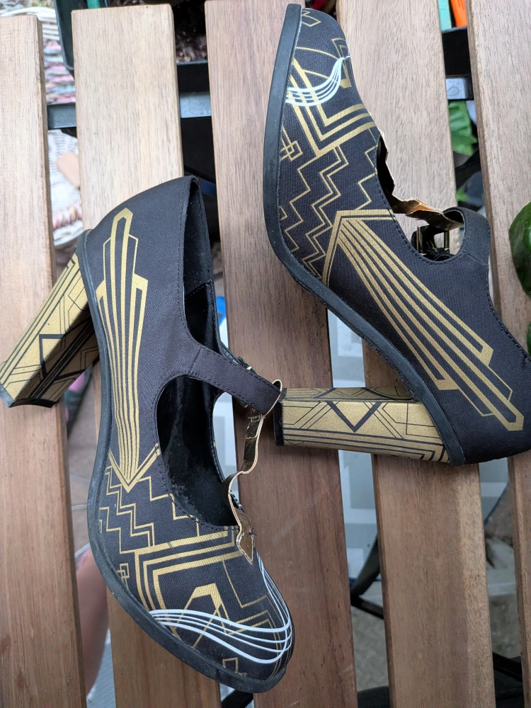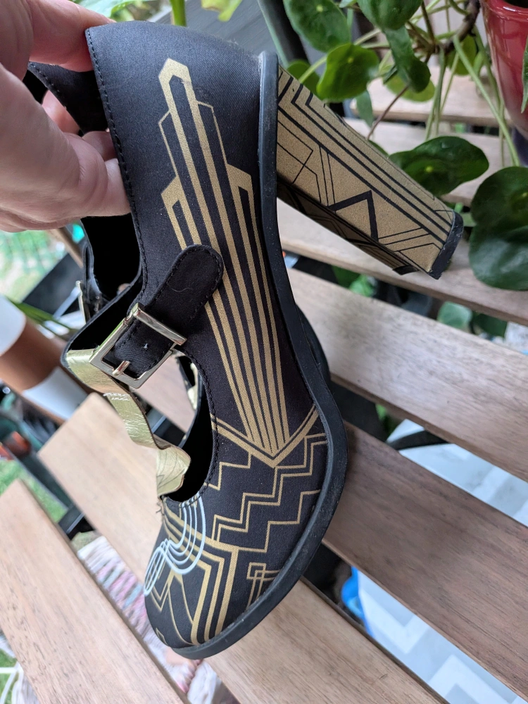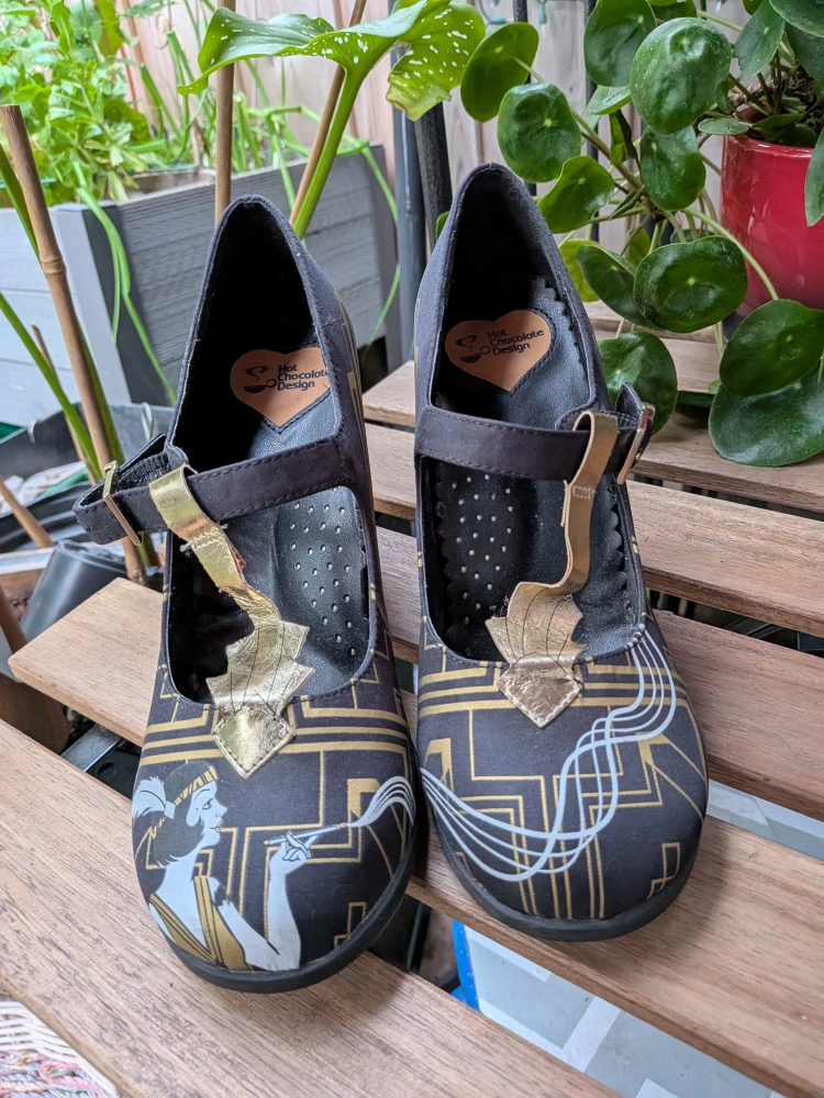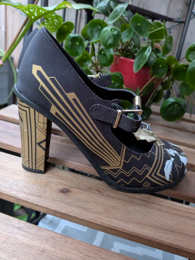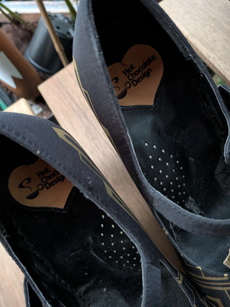 These eye-catching Hot Chocolate Design heels feature a striking Art Deco pattern in black and gold. They have a unique design that's sure to turn heads. Perfect for adding a touch of vintage glamour to any outfit! Good condition, but I tried to touch up heels with gold paint that was a little too light. No other issues Cash only, no etransfers Location: Etobicoke. Rathburn & Renforth dr