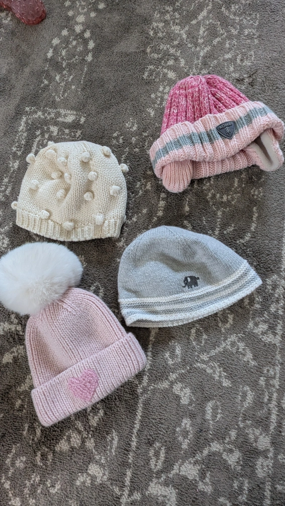 $5 each or take all 5 for $20 Selling a set of adorable baby beanies, perfect for keeping your little one warm! There are five hats included: one white beanie with pom poms, one pink and white striped beanie, one light pink beanie with a heart, and one grey beanie with elephants. The white beanie is made of 100% cotton shell and lining with 100% polyester filling, suitable for babies 0-6 months. The grey Gymboree beanie is brand new and fits 0-3 months, made of 60% cotton and 40% acrylic shell and 100% cotton lining. Pickup only St Clair East and O'Connor