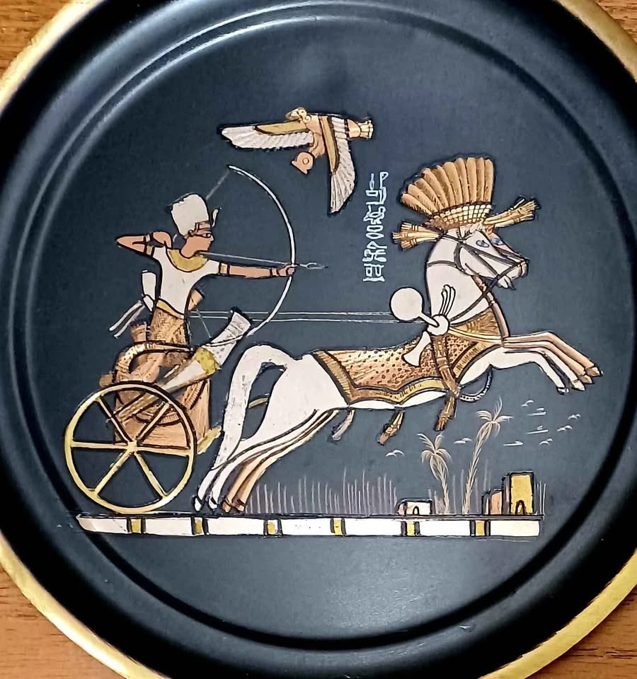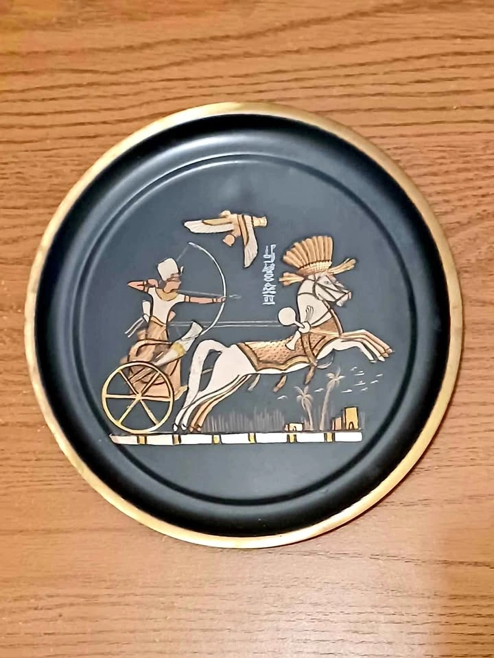 Decorative, hand carved, ebonized brass plate featuring Ramesses II in his War Chariot, during the Battle of Kadesh, a major conflict between the Egyptian & Hittite Empires around 1274 BC. Diameter: 22 cm. Very good condition. Please check out my other rare items!