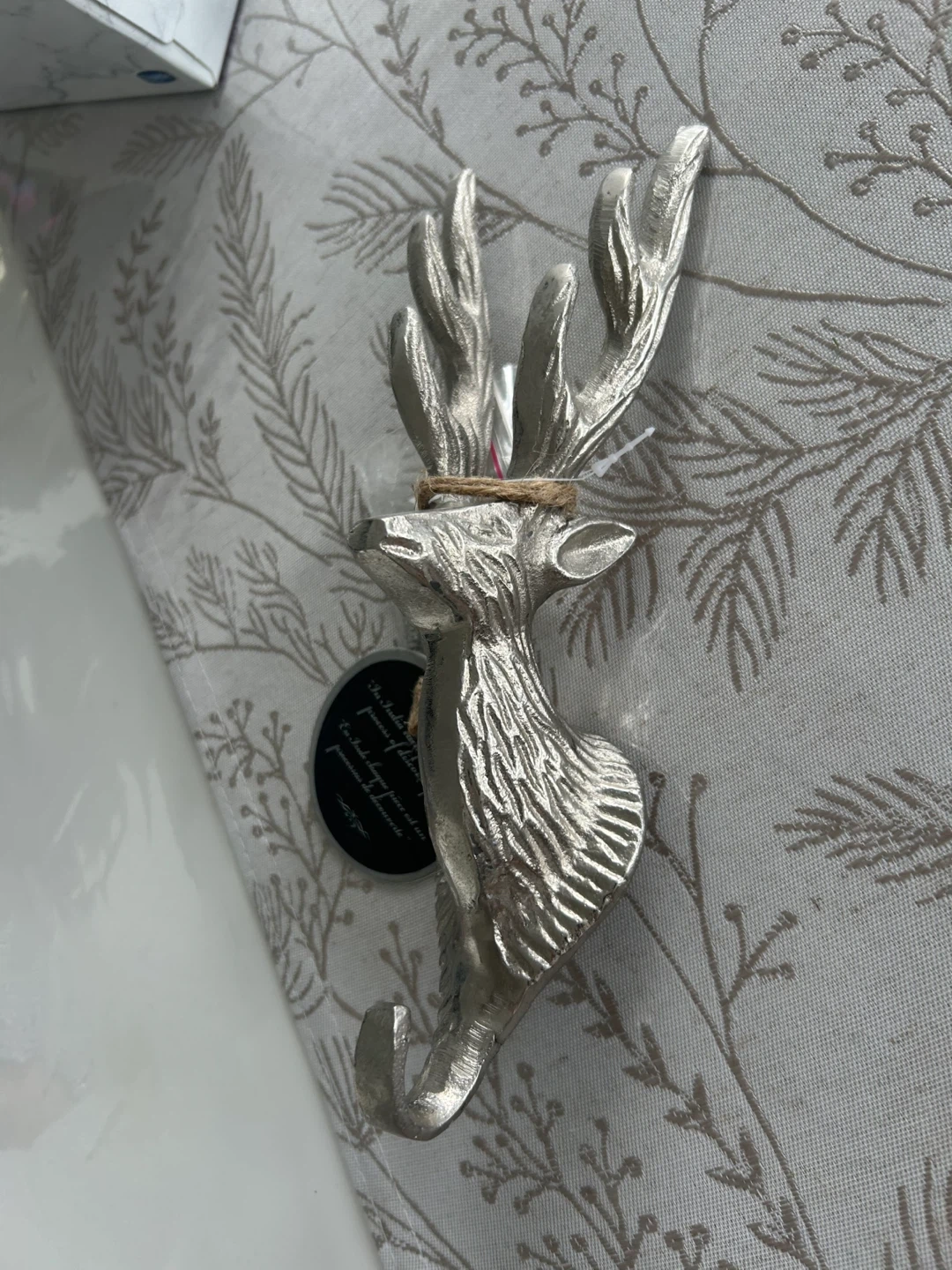 Add a touch of rustic charm to your home with this silver reindeer wall hook! It's perfect for hanging coats, hats, or even just as a decorative piece. It is brand new and still has the tag attached. It is made of durable material and is sure to last for years to come