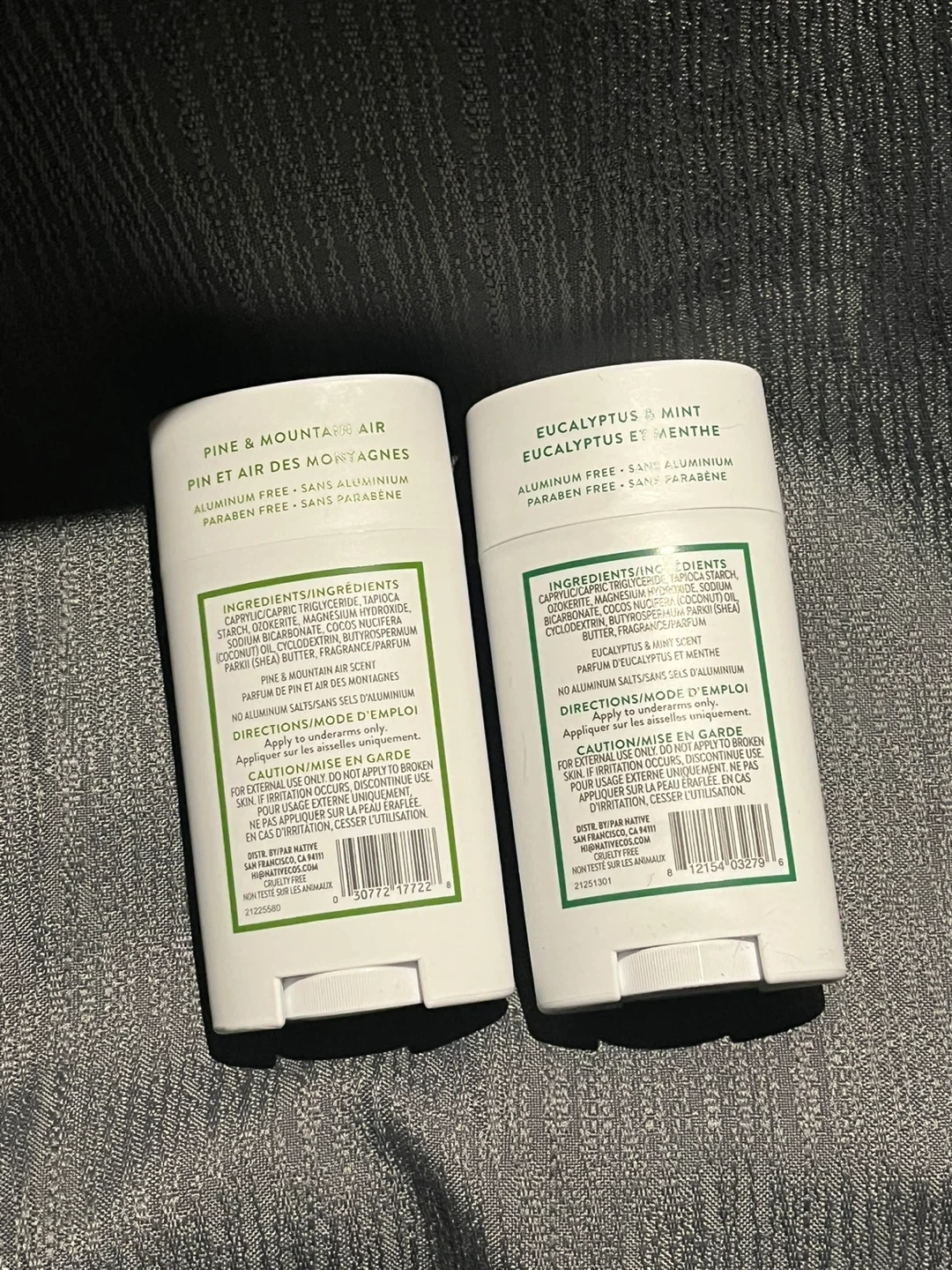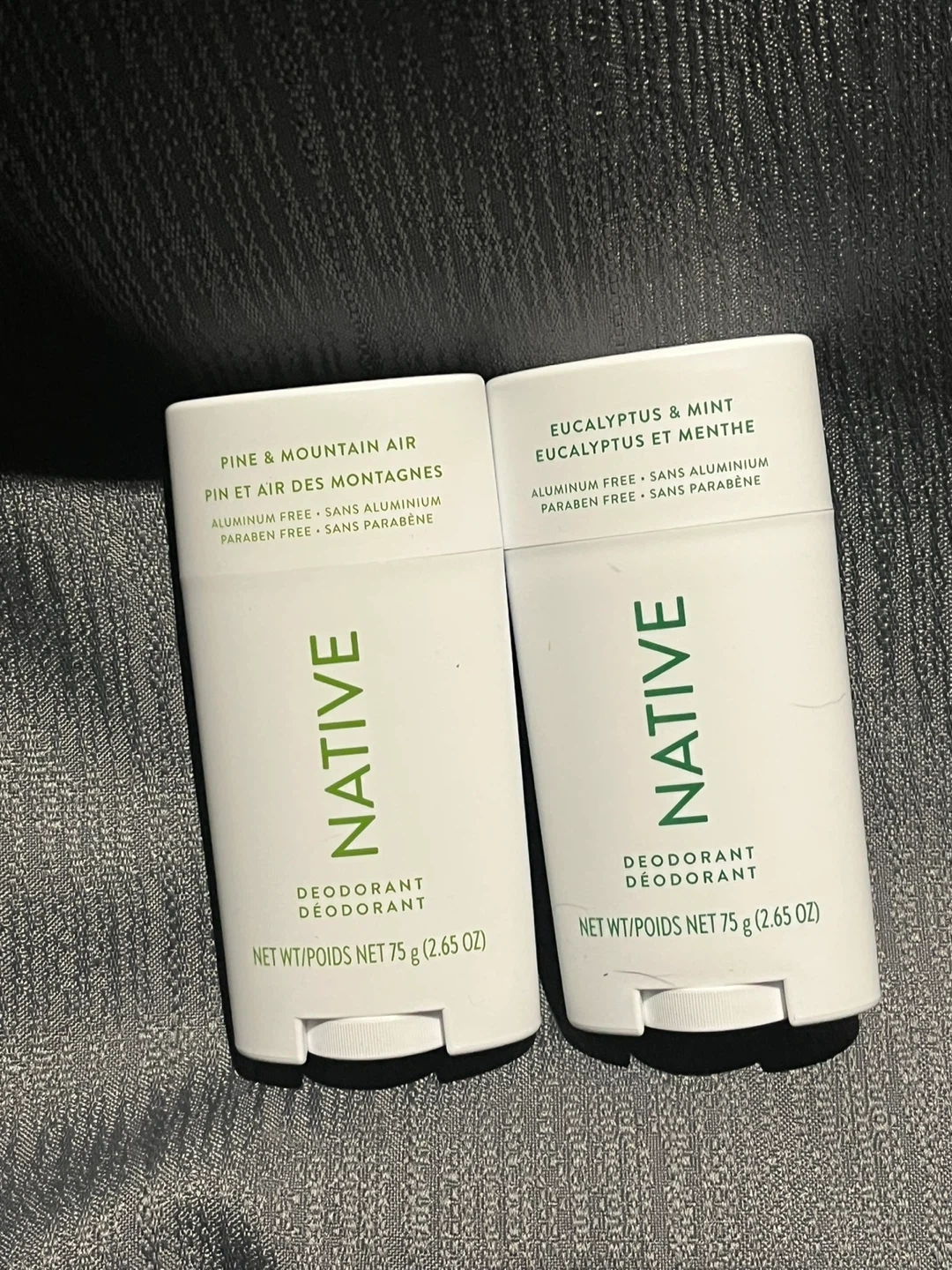 Selling two Native deodorants! One is Pine & Mountain Air and the other is Eucalyptus & Mint. They are aluminum and paraben free, and each contains 75 g (2.65 oz) of deodorant