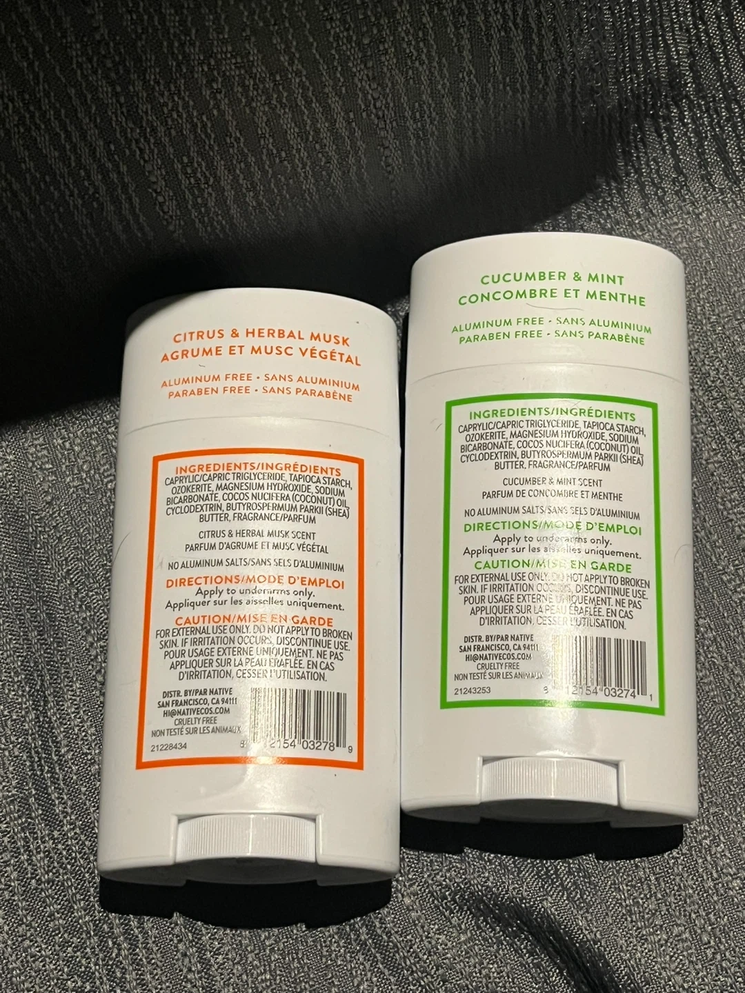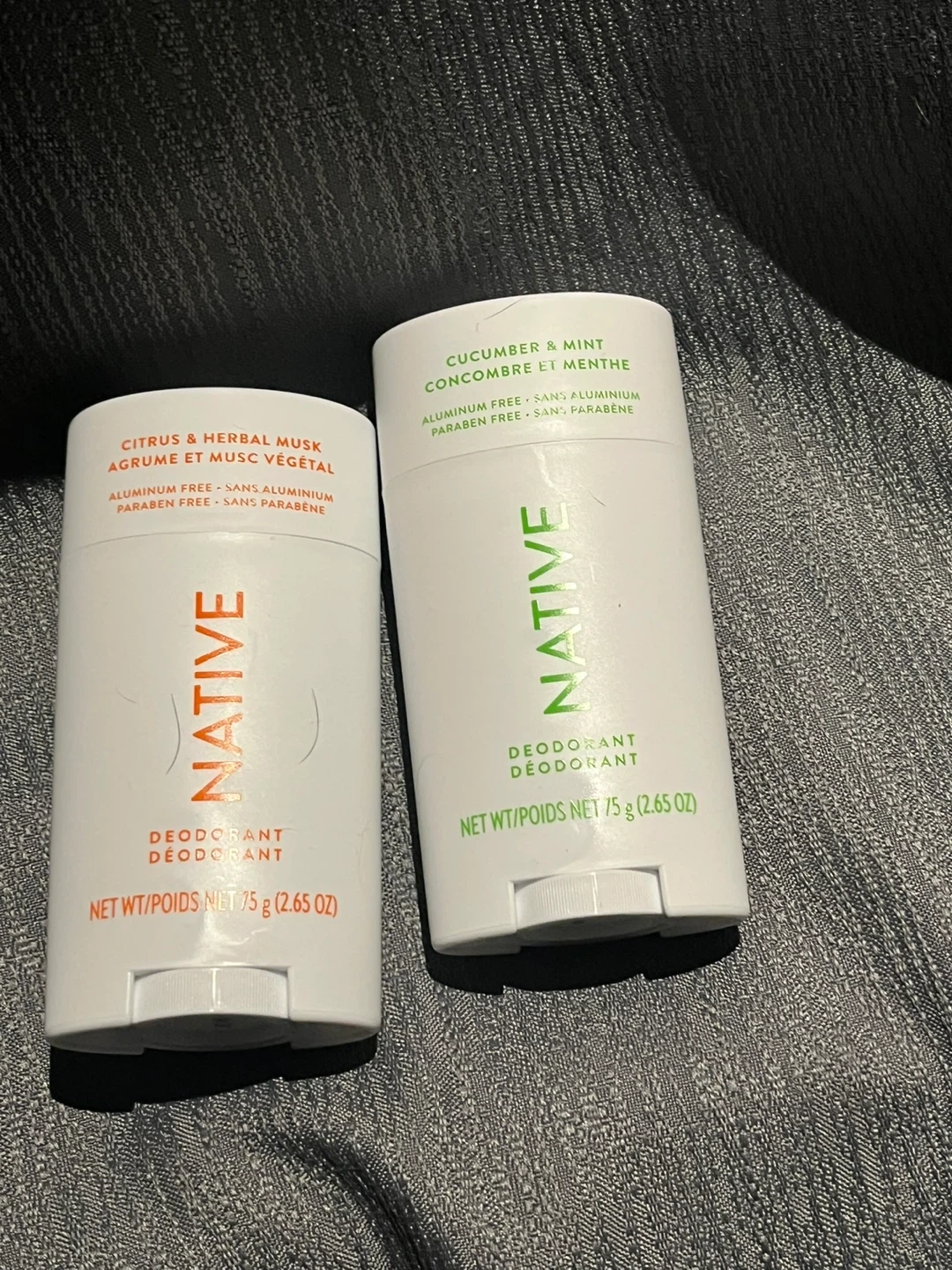 Selling two Native deodorants! One is Citrus & Herbal Musk, and the other is Cucumber & Mint. Both are aluminum-free, paraben-free, and come in 75g (2.65 oz) sizes. Perfect for staying fresh!