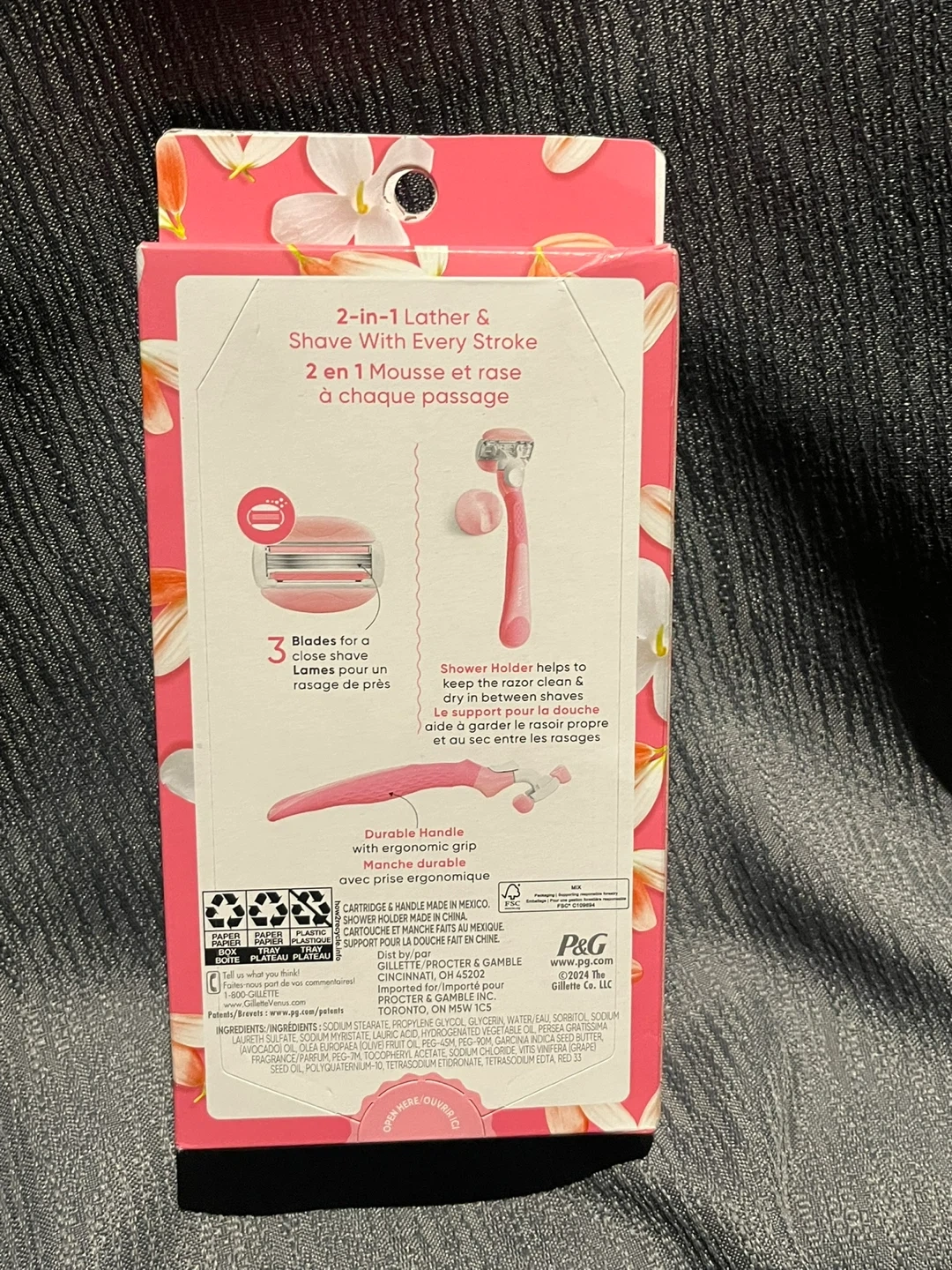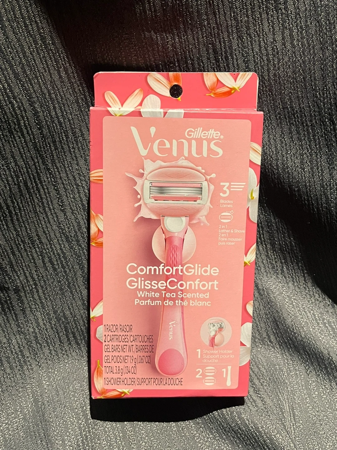 Get a smooth shave with the Gillette Venus ComfortGlide White Tea razor! This 2-in-1 razor lathers and shaves with every stroke. It includes 3 blades for a close shave and a durable handle with an ergonomic grip. Also included is a shower holder to keep the razor clean and dry between shaves