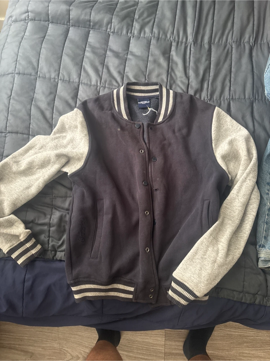Selling a Superdry varsity jacket. It's in good condition and is a stylish addition to any wardrobe. The jacket is a navy colour with grey sleeves. Missing one button