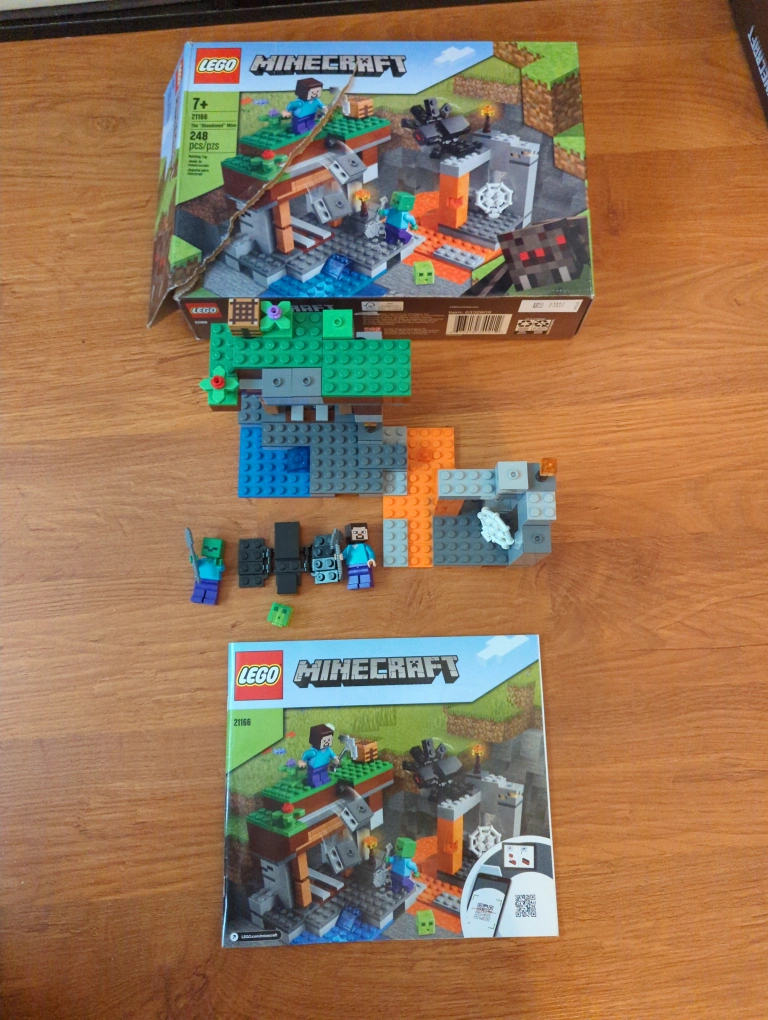 Selling a LEGO Minecraft set, model 21166, called "The Abandoned Mine"! The set is complete and assembled, and comes with the box and instruction booklet. It's a fun build for Minecraft fans!