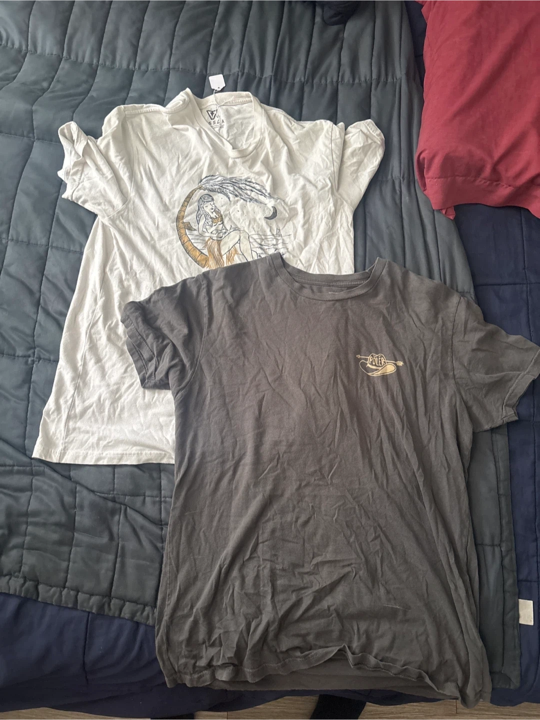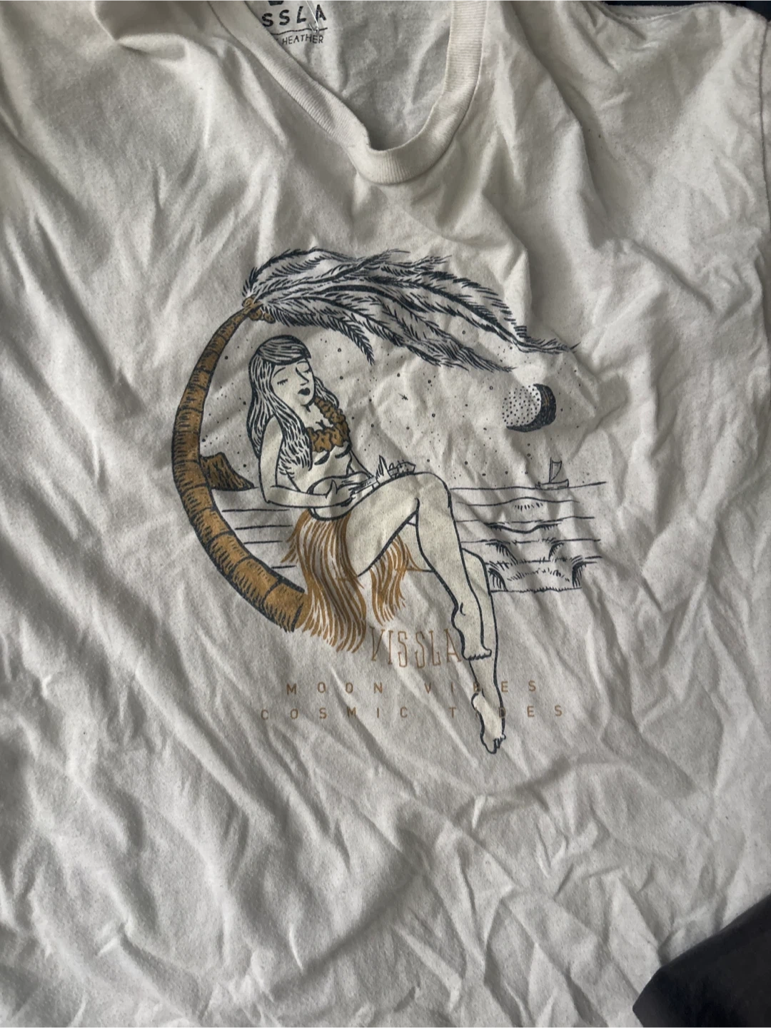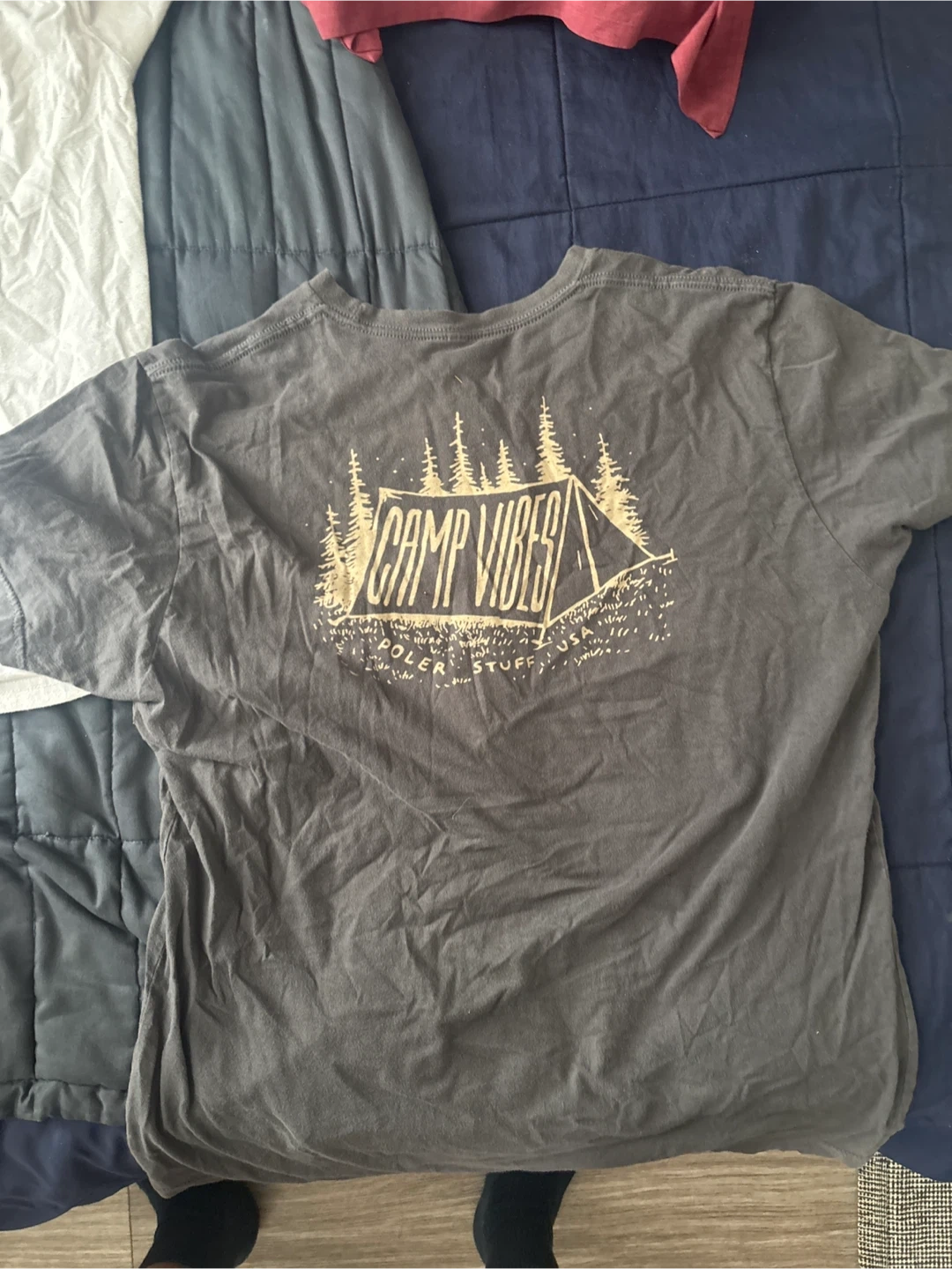 Selling a grey Poler Stuff t-shirt with a 'Camp Vibes' design. It's in good condition and ready for a new home! White Vissla Shirt with awesome tropical island vibe design on it! $10 each or 2 for $15!