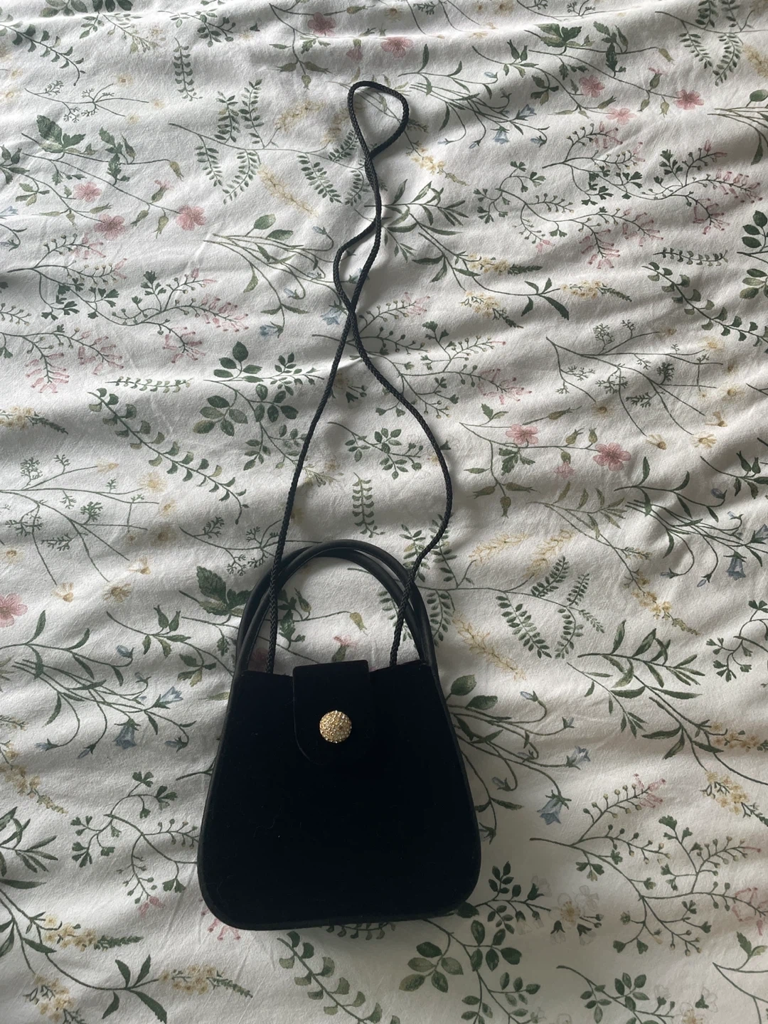 Selling a cute black velvet mini bag! It has a small handle and a long strap, making it versatile for different occasions. The bag features a decorative gold button on the front flap. It's in great condition and ready for a new home