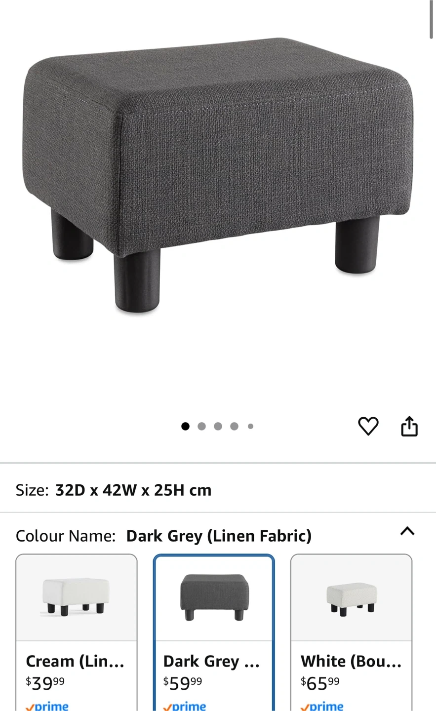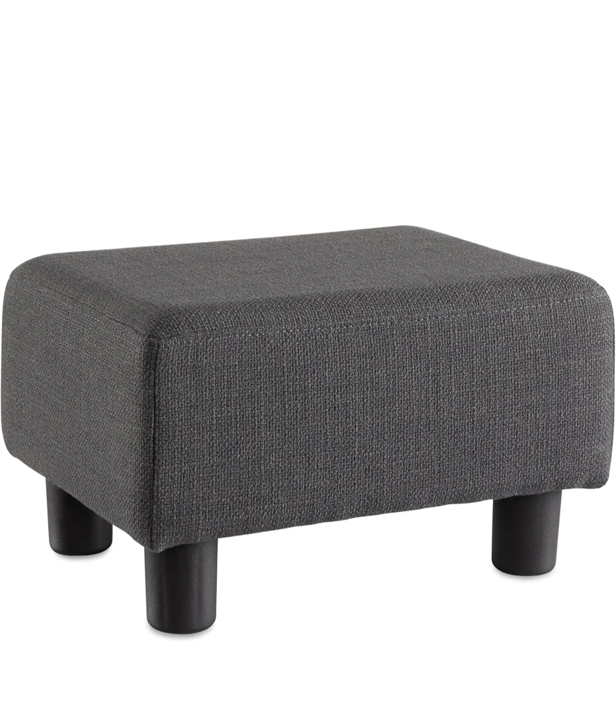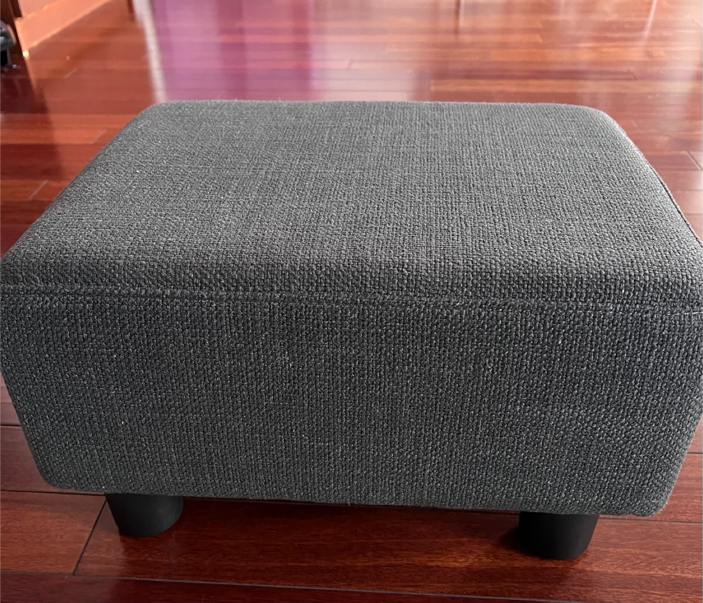 This small rectangle-shaped footstool is in dark grey linen fabric. It features sturdy plastic legs with non-slip pads and a hidden pocket in the bottom. The size is 32D x 42W x 25H cm