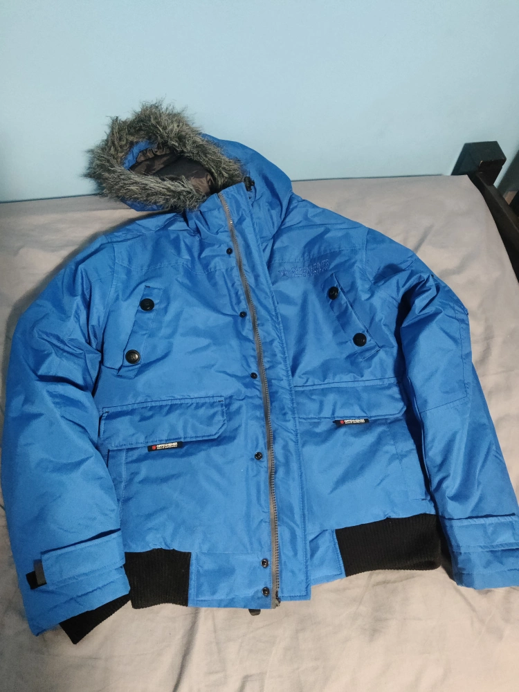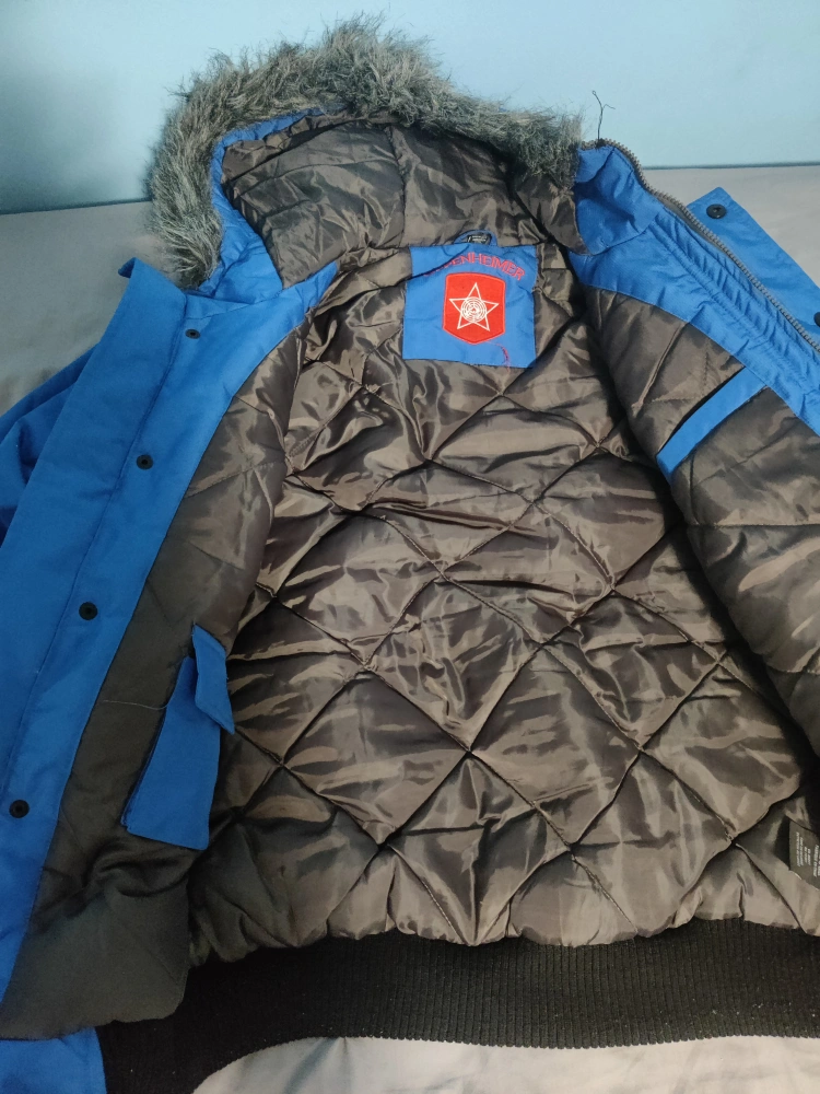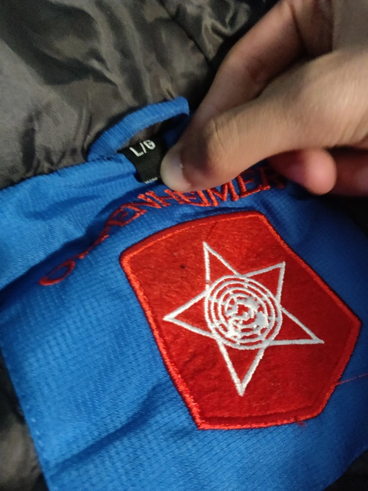 Selling a blue Oppenheimer winter jacket in size L. It has a faux fur hood and a unique design on the chest.